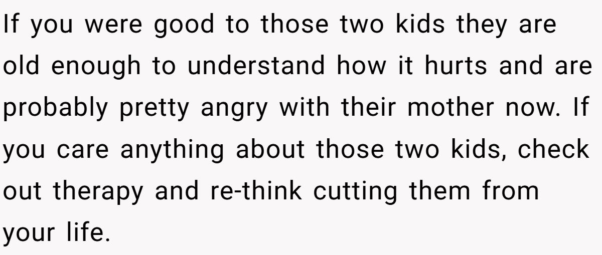 If you were good to those two kids they are old enough to understand how it hurts and are probably pretty angry with their mother now. If you care anything about those two kids, check out therapy and re-think cutting them from your life.