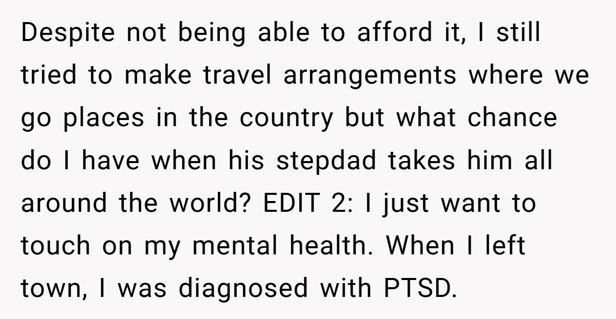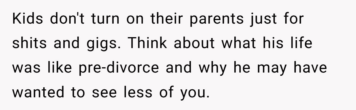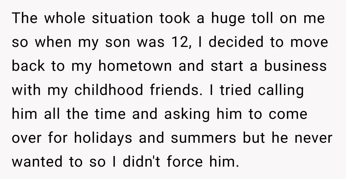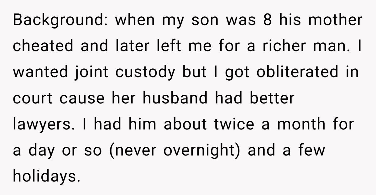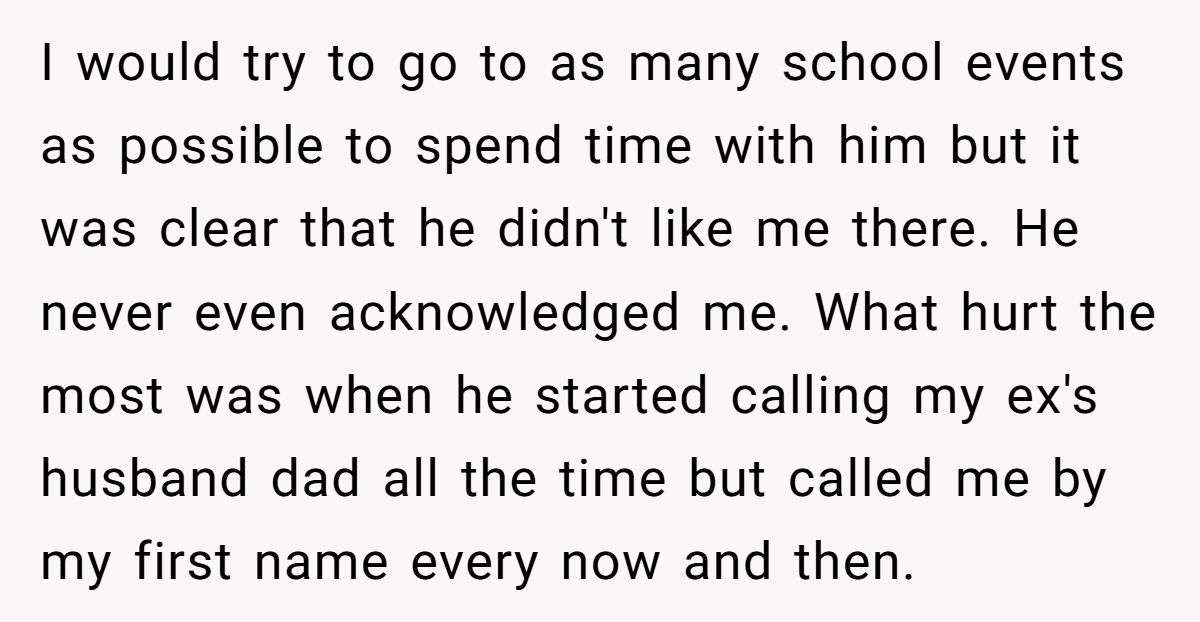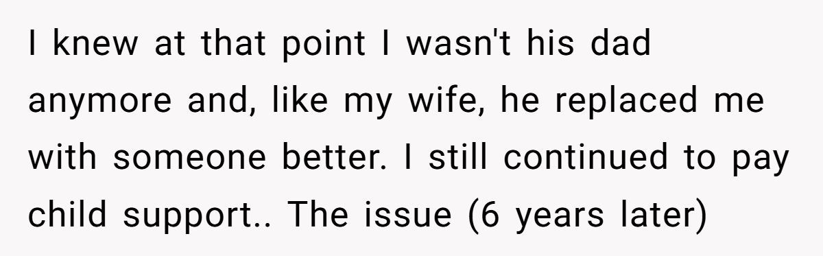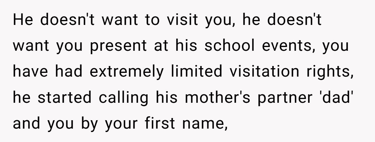 The father explains that his marriage fell apart due to infidelity, and during the divorce, his wife was granted primary custody. Though he tried to stay involved, it became clear that his son preferred his new stepfather—calling him “Dad,” ignoring messages, and keeping his distance.