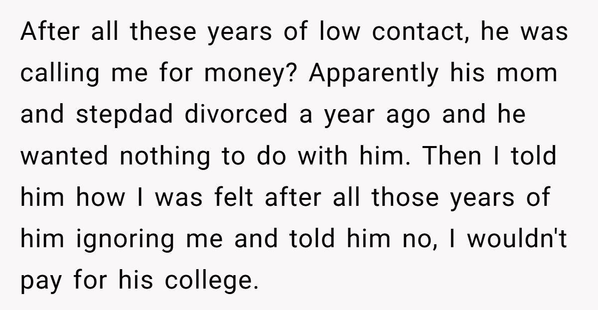 After a bitter divorce, limited custody, and a son who gradually replaced him with a stepdad, this father tried to move on, eventually starting a new family. But when his now 18-year-old son—estranged and mostly silent for years—called him out of the blue to ask for college funding, he said no. Cue the fallout: an angry ex, a hurtful insult, and a family divided.