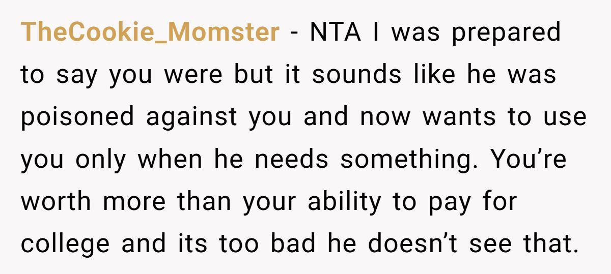 Could he have offered a conditional arrangement—tuition help in exchange for rebuilding a relationship? Possibly. But for many parents, especially those emotionally wounded, sudden financial requests can feel transactional and hollow. After being treated like a stranger, this dad had every reason to pause before opening his checkbook.