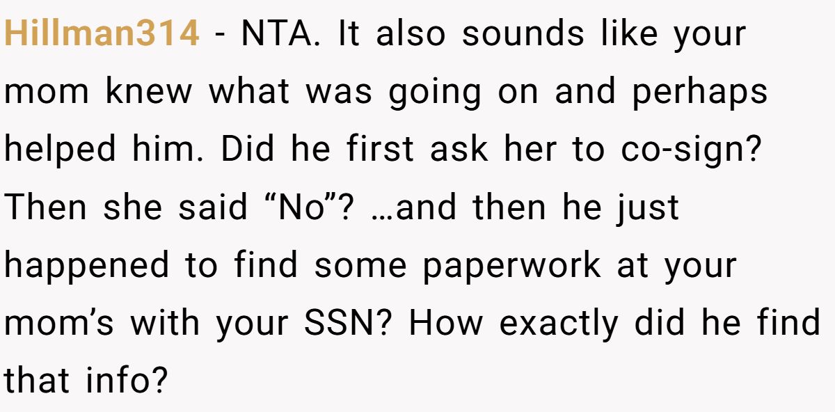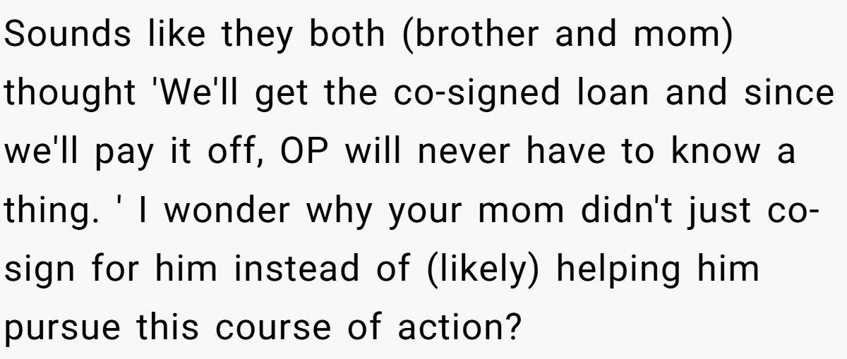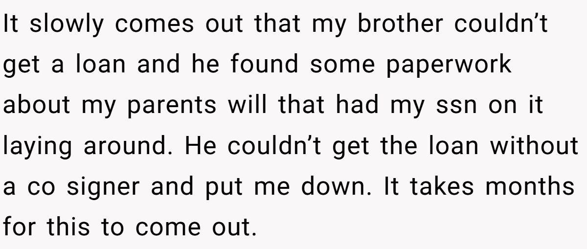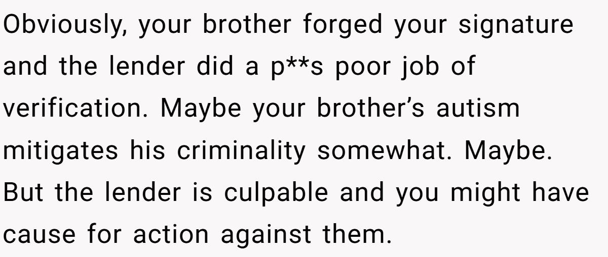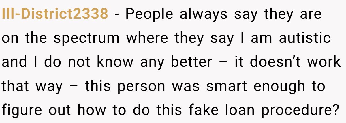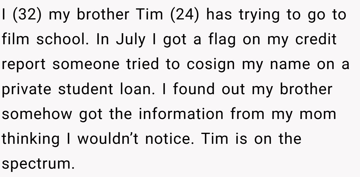 Tim, 24, autistic and living back home, had quietly borrowed private documents their mother carelessly left out to co-sign a hefty student loan without a word. Meanwhile, the Redditor was across the country, working hard to build the life he’d always dreamed of, saving for a house and protecting his credit like it was gold.