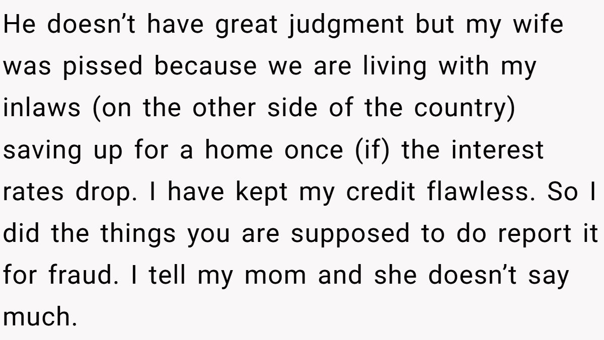 For years, the Redditor and his wife had scraped together savings for a down payment, living frugally with his in-laws to make their dream a reality. His credit score was immaculate, the foundation of every plan he had carefully laid. But in an instant, that stability was threatened.