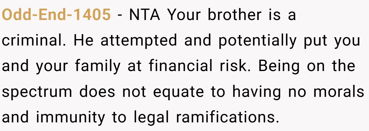Commenters were clear: autism isn’t a free pass for fraud, and the brother’s calculated scheme. and the parents’ possible complicity.