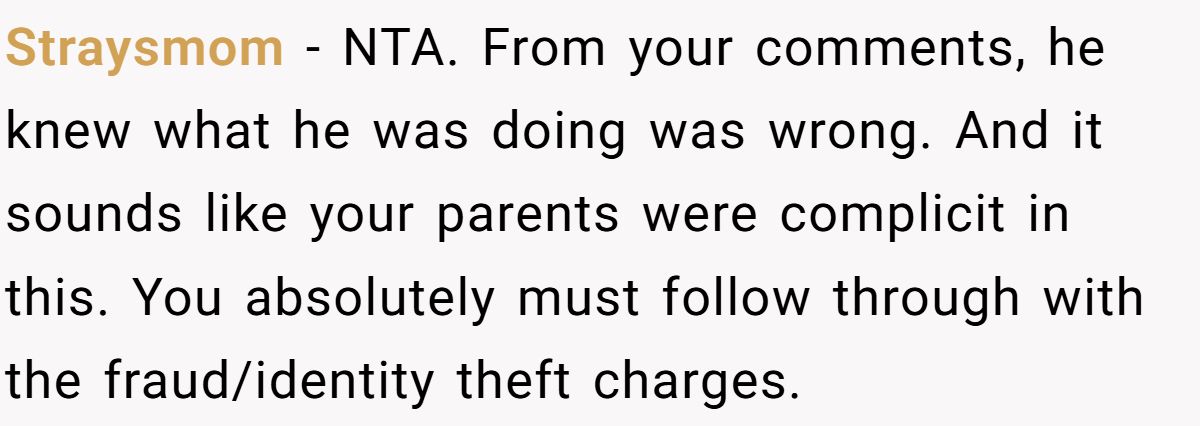 Tim’s attempt to co-sign a student loan wasn’t a harmless mistake. It was identity theft with real legal consequences. The Redditor’s anger boiled over, fueled by a sense of betrayal that his own brother had tried to sabotage him.