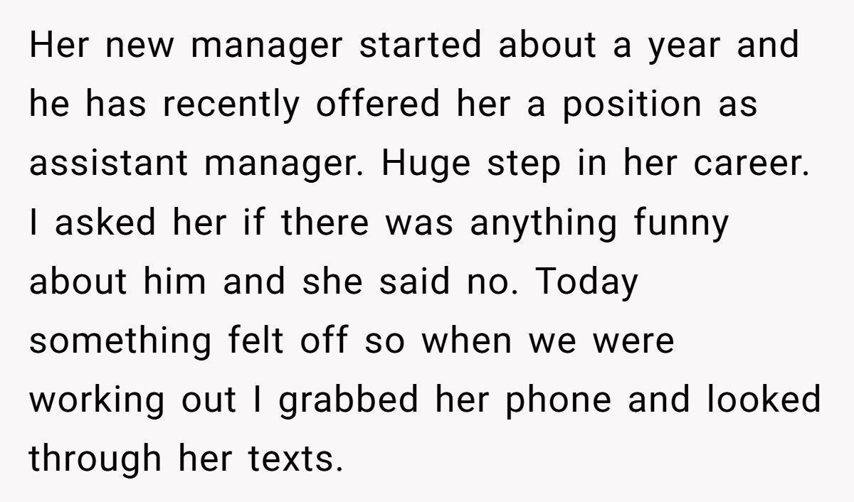 According to the Redditor, things blew up during a workout session when he noticed the message on his wife’s phone. Her boss had thanked her for taking a last-minute shift by calling her “an angel from heaven.” The Redditor didn’t think much of it at first—until he realized the sender was a man.