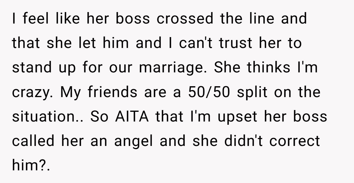 That’s exactly what happened to a 35-year-old Redditor who stumbled across a text from his wife’s boss that read, “You’re an angel from heaven.” Just a thank-you for picking up an extra shift… or something more? Add in past trauma from infidelity, the emotional toll of ongoing fertility treatments, and a recent promotion for his wife, and suddenly this seemingly innocent text spiraled into a full-blown argument.