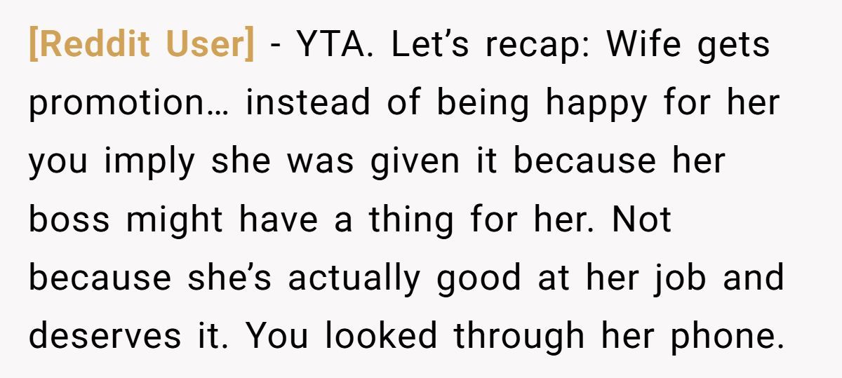 Reddit users were clear: YTA. They criticized the husband for projecting past trauma onto his current wife, snooping through her phone, and implying she got promoted due to favoritism rather than merit.