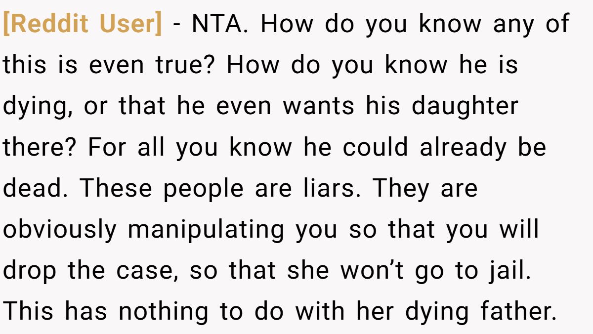 ![This Man Refused To Drop A Defamation Case Against His Ex-wife Despite Her Family’s Desperate Pleas [Reddit User] − NTA. How do you know any of this is even true? How do you know he is dying, or that he even wants his daughter there? For all you know he could already be dead. These people are liars. They are obviously manipulating you so that you will drop the case, so that she won’t go to jail. This has nothing to do with her dying father.](https://dailyhighlight.com/wp-content/uploads/2025/07/45016-15.jpg)