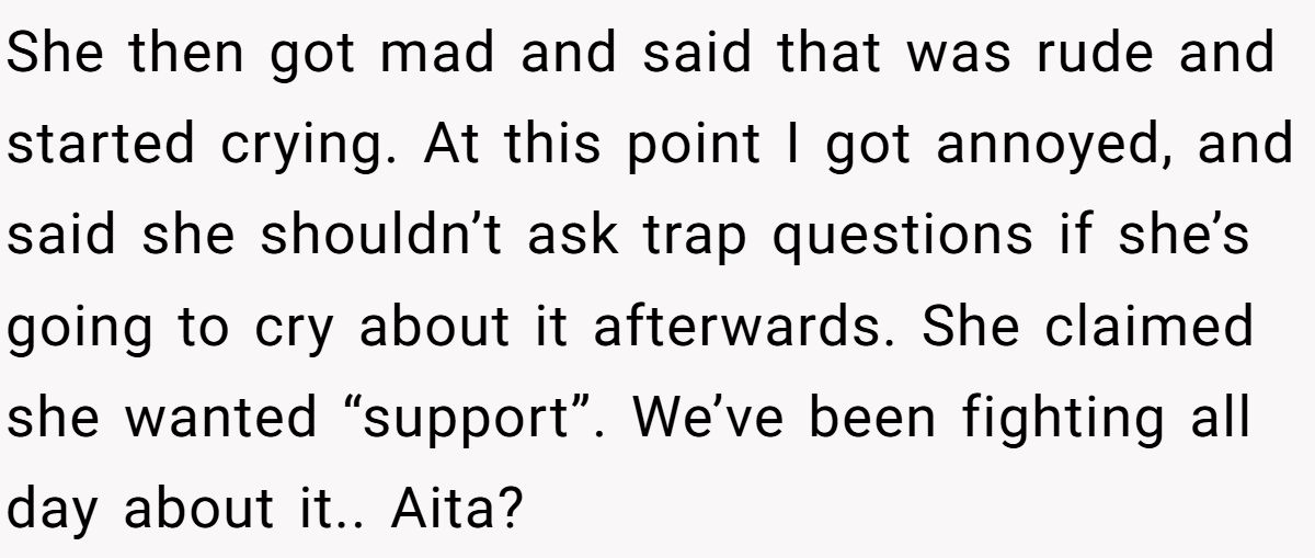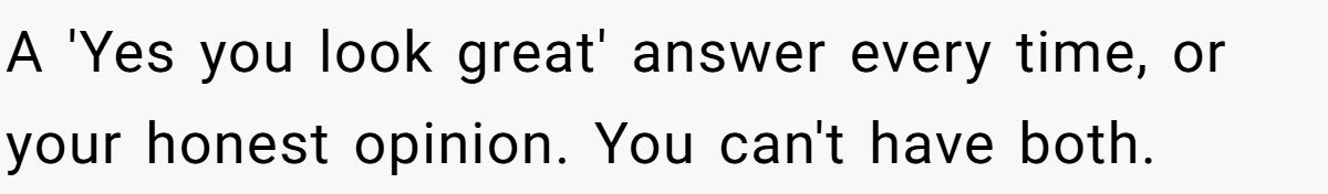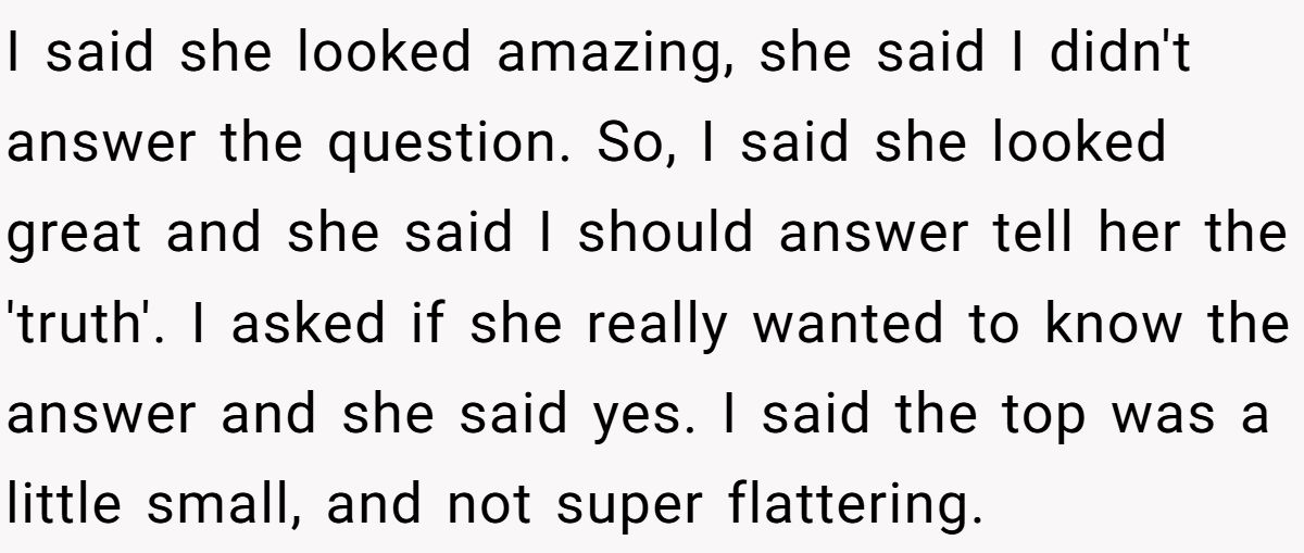 So who was truly at fault here? Was he wrong for calling out the “trap,” or was she unfair to demand honesty she wasn’t ready to hear? If someone you loved asked whether an outfit made them look fat, would you lie to protect their feelings or risk the truth?