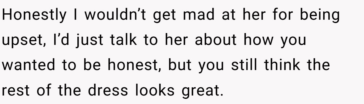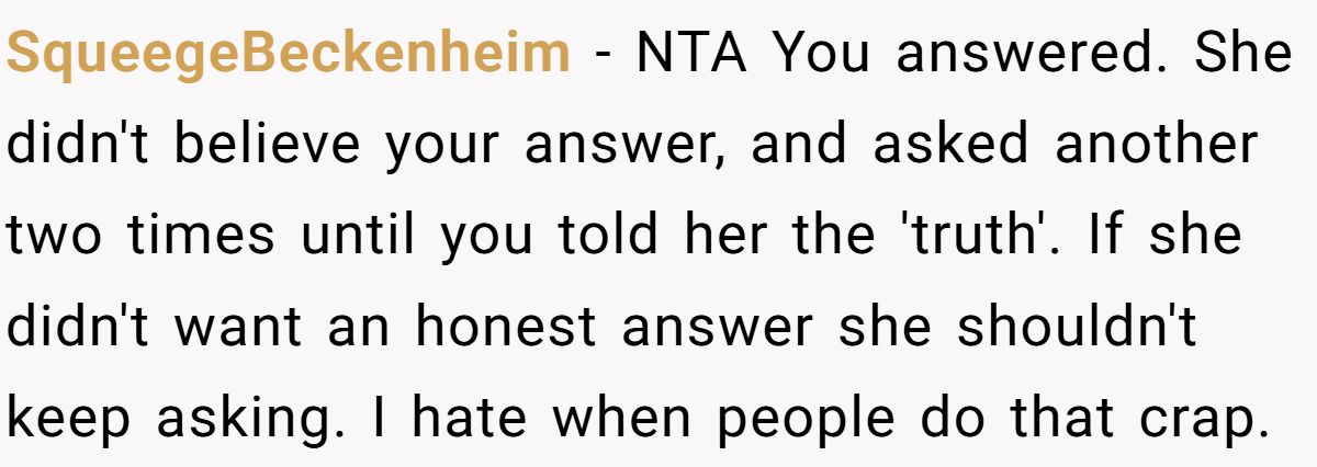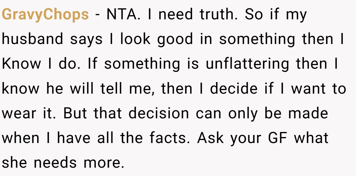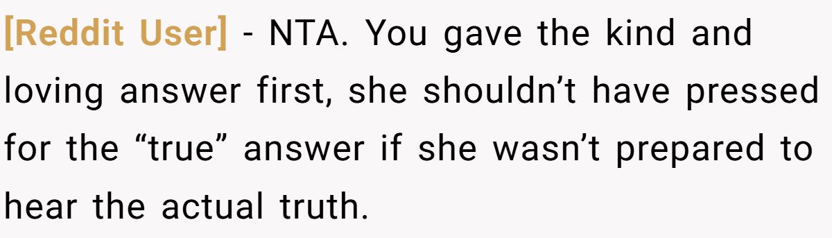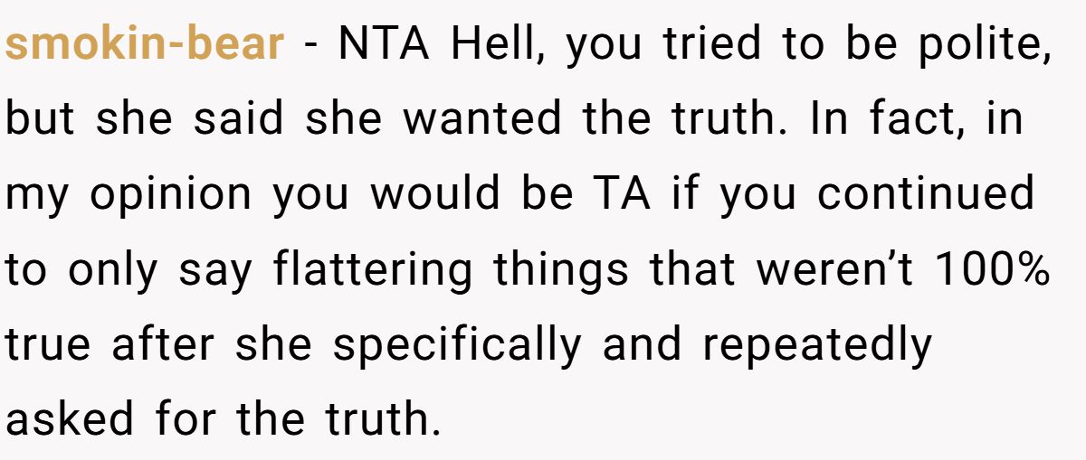 Most commenters agreed he wasn’t wrong, she asked for honesty, pressed for it, and then got upset when he answered truthfully.