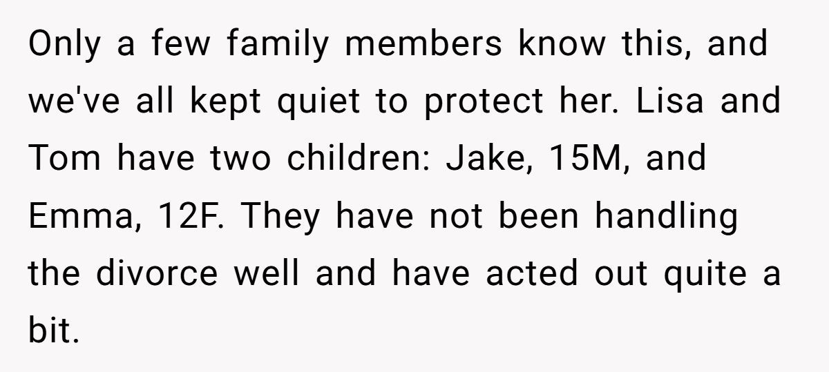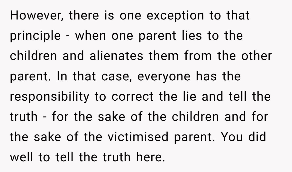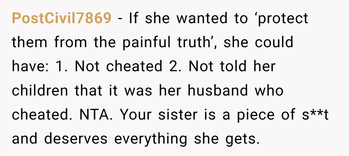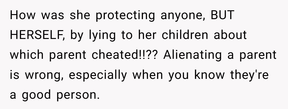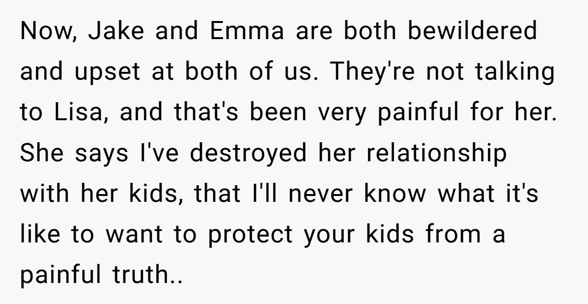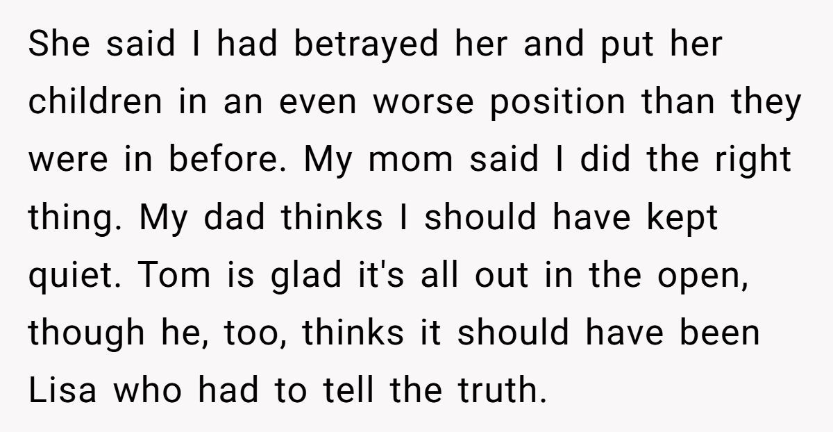 Could she have approached it differently? Possibly. A private conversation with Lisa, urging her to tell the truth herself, might have been more tactful. But considering the ages of the kids—and the pain they were carrying—it’s understandable why the Redditor snapped. At some point, the truth becomes less about loyalty to adults and more about protecting the emotional well-being of the children.