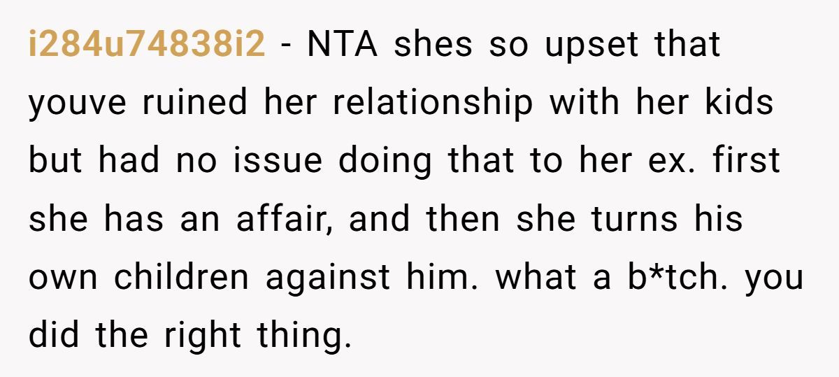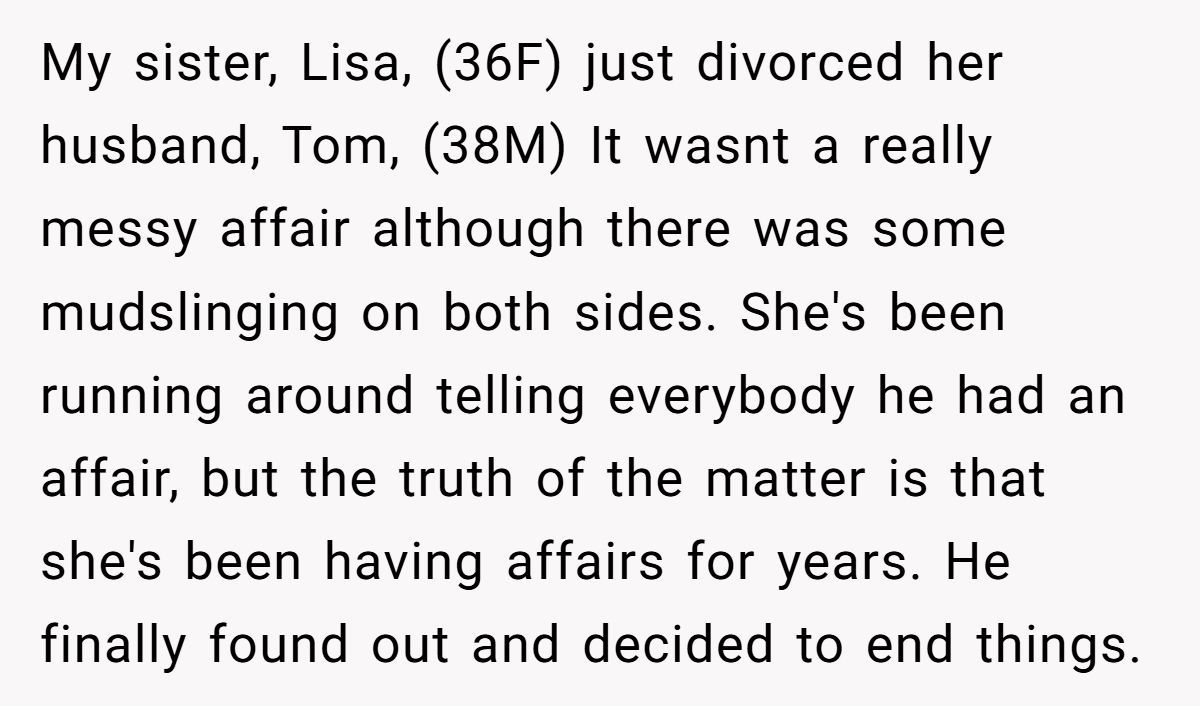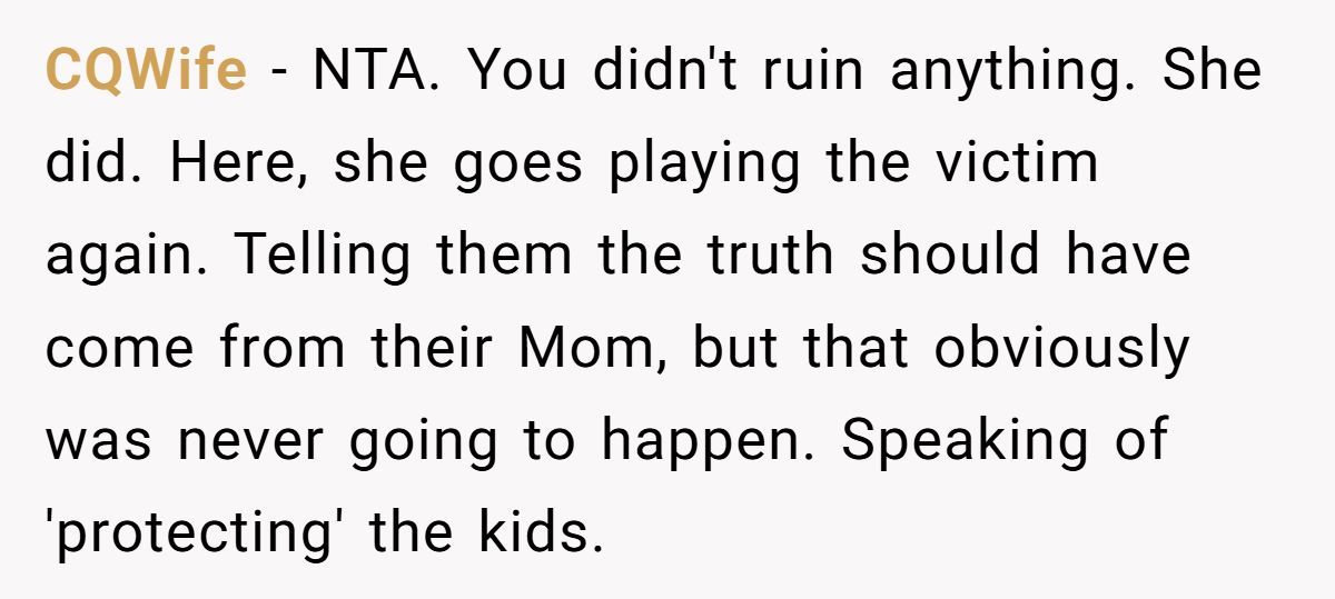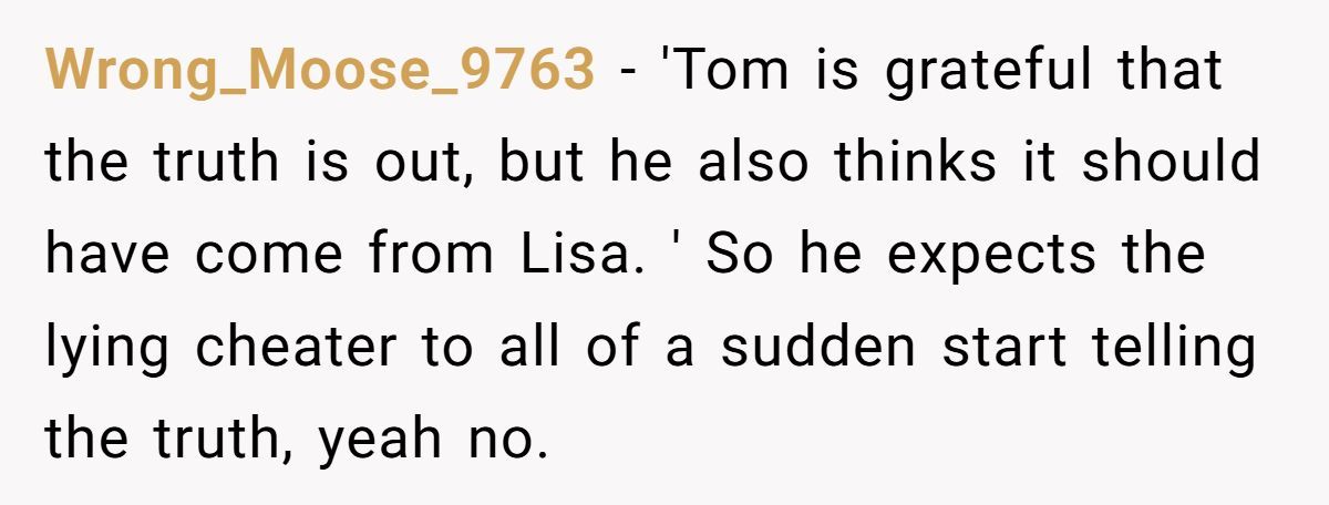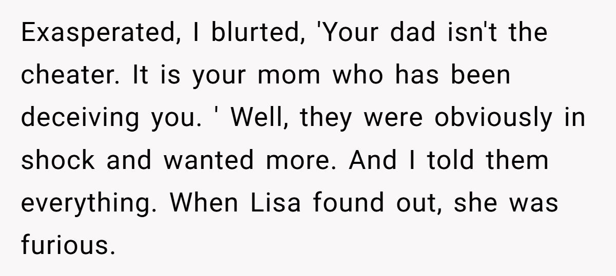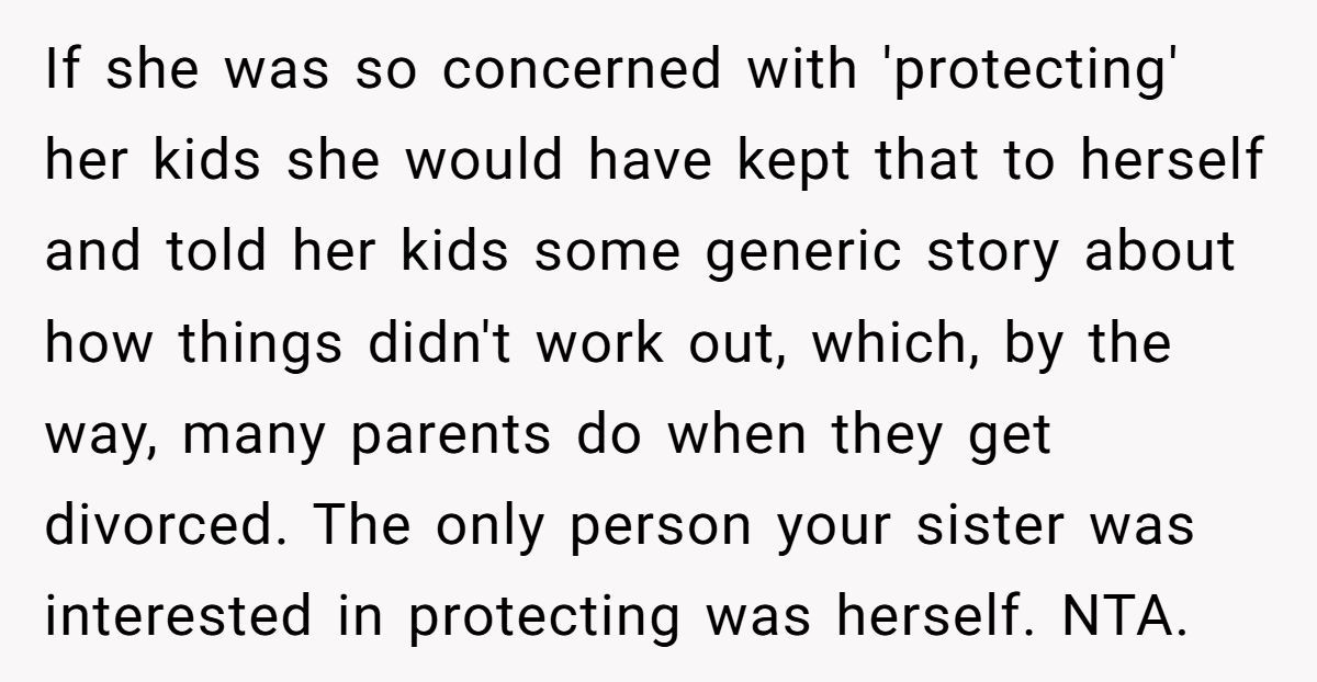 Could she have approached it differently? Possibly. A private conversation with Lisa, urging her to tell the truth herself, might have been more tactful. But considering the ages of the kids—and the pain they were carrying—it’s understandable why the Redditor snapped. At some point, the truth becomes less about loyalty to adults and more about protecting the emotional well-being of the children.