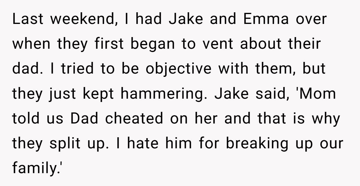 The Redditor explains that her sister, Lisa, had long blamed her ex-husband Tom for the end of their marriage. She told their children that he had an affair, that he abandoned the family, and that he couldn’t be trusted. As a result, Jake and Emma developed a strained relationship with their father and often vented their anger at family gatherings.