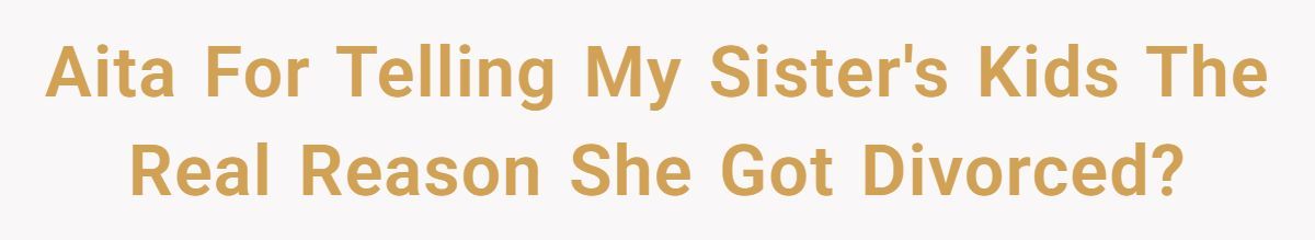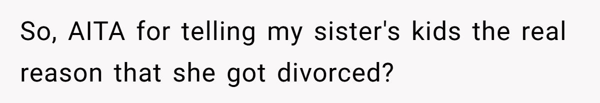 Fed up with hearing Jake, 15, and Emma, 12, trash their father over a lie, the Redditor blurted out the truth. The kids were stunned. Lisa was furious. And now the entire family is reeling from the fallout. Was this aunt brave for finally telling the truth, or did she cross a line by revealing a painful secret in the heat of the moment?