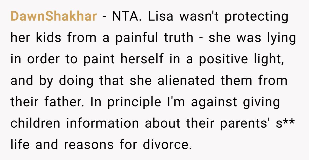 Commenters agreed OP was not the asshole, emphasizing that Lisa’s lies alienated her children from their father and that telling the truth was necessary to correct the damage.
