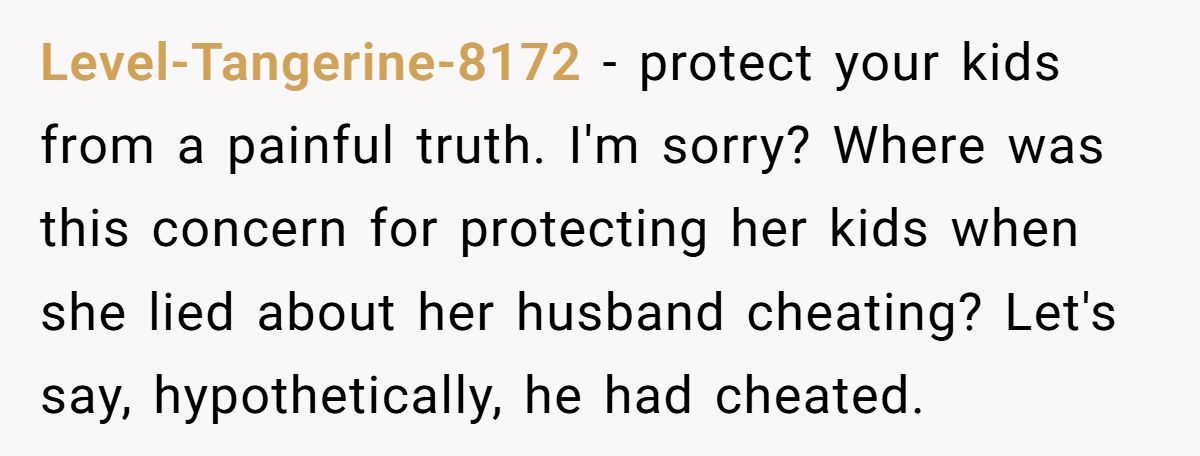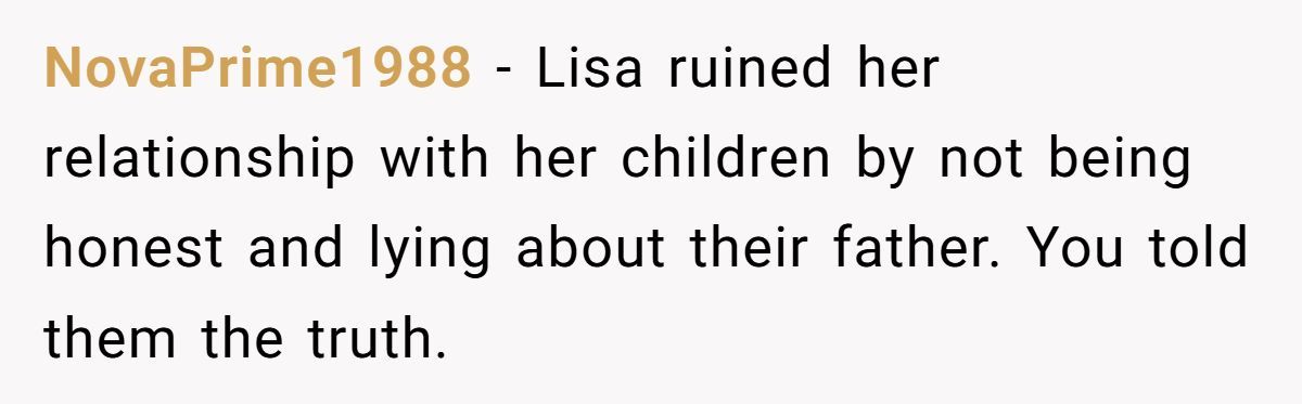Redditors called out Lisa’s hypocrisy, saying she never protected her kids—only herself—by lying, and agreed OP did the right thing by telling the truth.