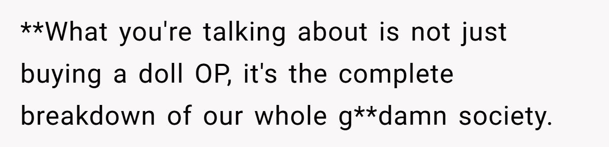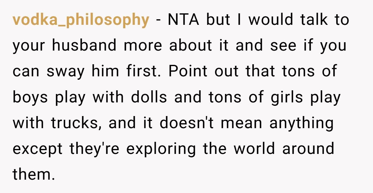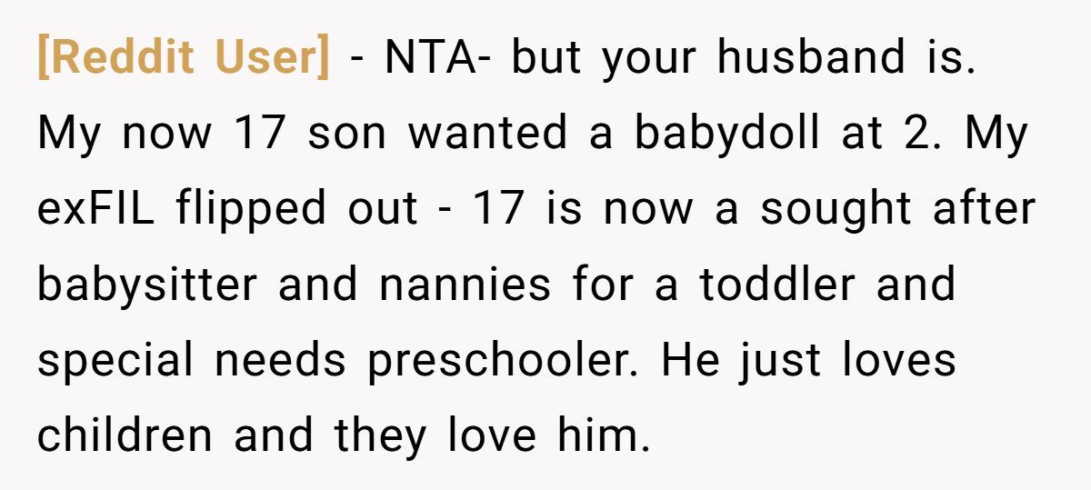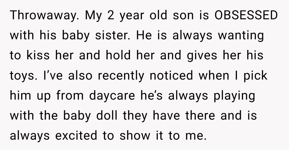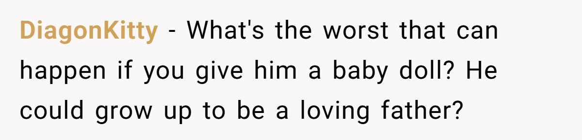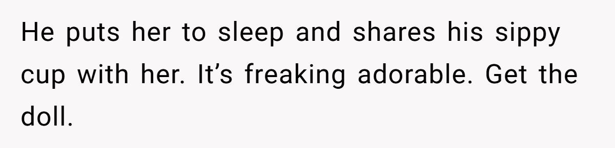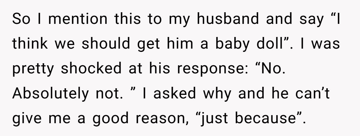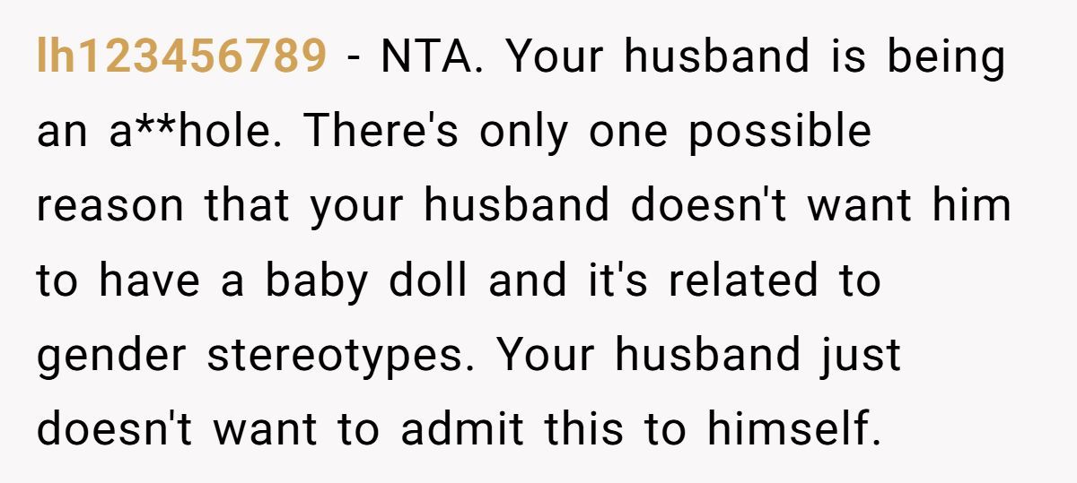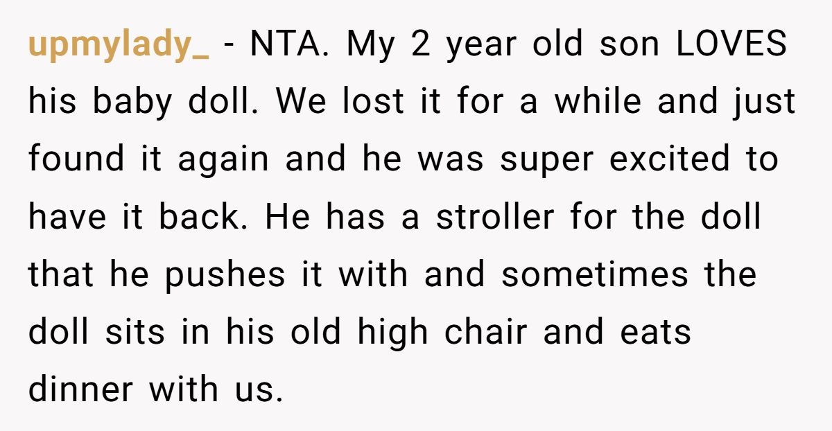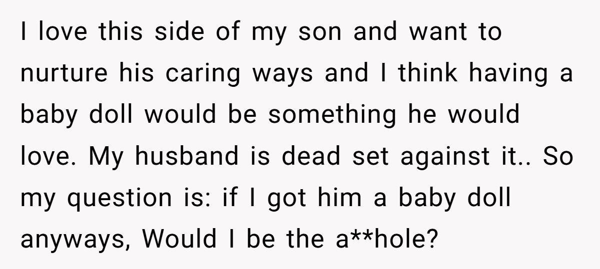 This Redditor’s parenting puzzle comes straight from the modern mom handbook. Her toddler is obsessed with a baby doll at daycare – hugging, feeding, and tucking it in like a tiny caregiver-in-training. Inspired, she wants to buy him his own. But her husband? Hard stop.