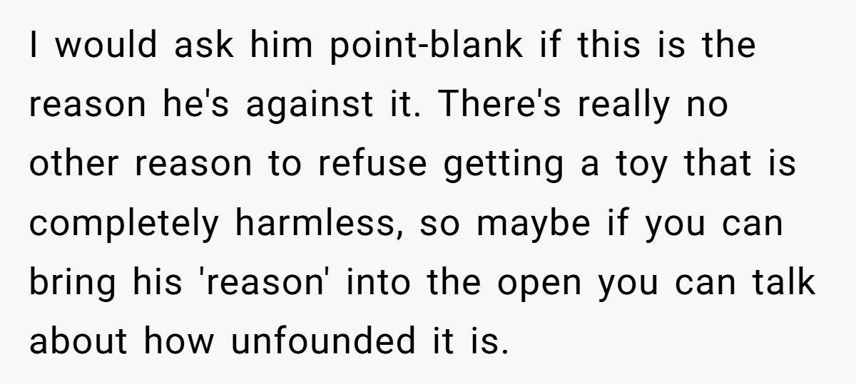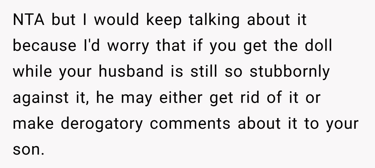 In short, Mom’s instinct is spot-on. But buying the doll behind Dad’s back might create more friction than trust. It could also make their son feel stuck in the middle of grown-up tension.