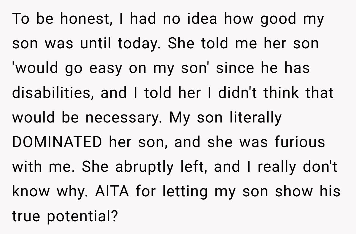 According to the post, she expected her son to dominate and was caught off guard when the opposite happened. Rather than celebrating the fun, she ended the playdate early and left in a huff.