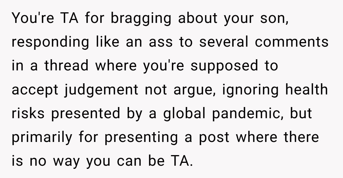 Many agreed: YTA—mainly for ignoring pandemic rules, acting smug in the comments, and asking a question that didn’t match your post.