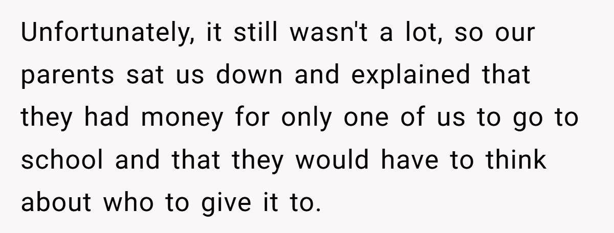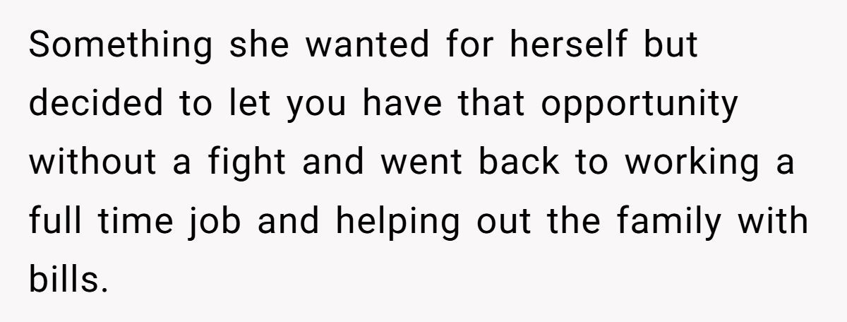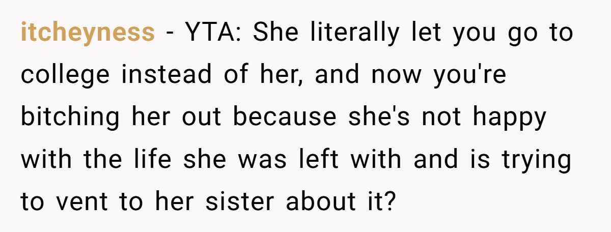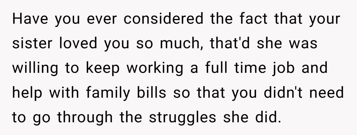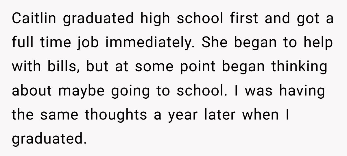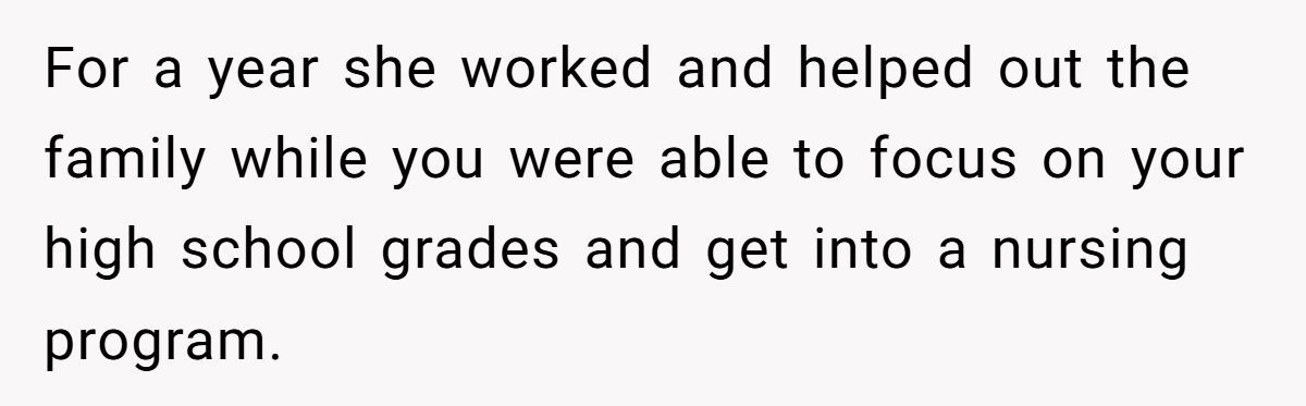 The original post reads like the script of a tense family drama. Caitlin had sacrificed her dreams for her sister’s future, working full-time at 18 to help with bills while her younger sibling went off to college.