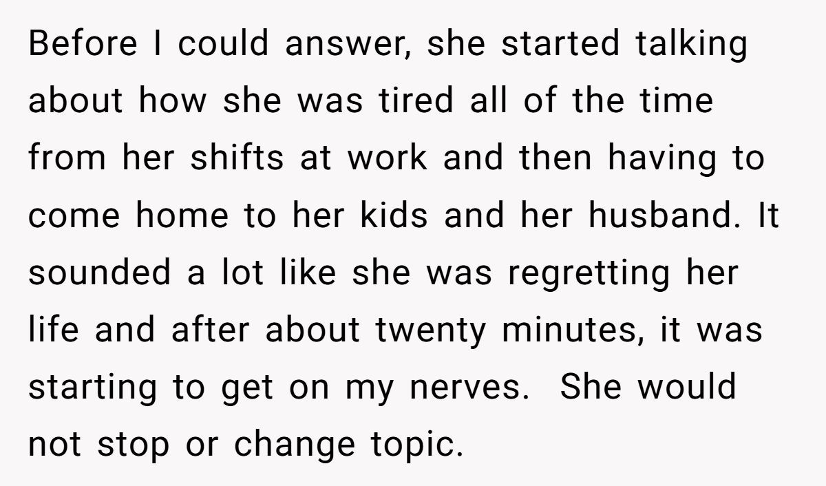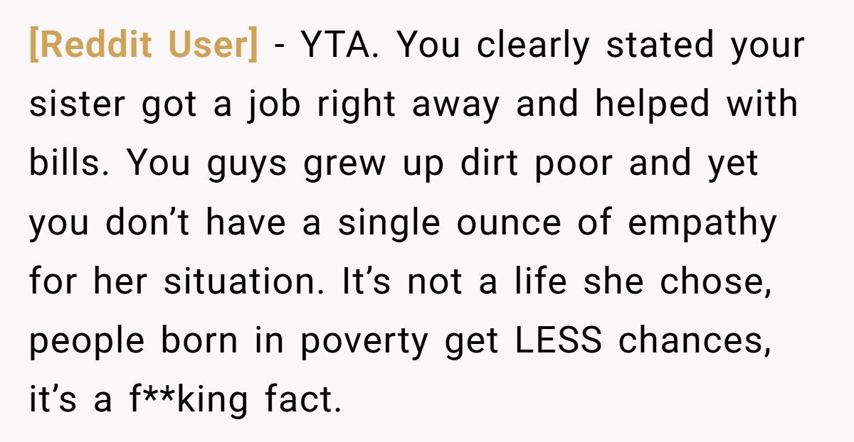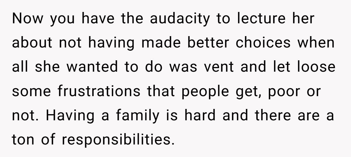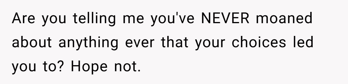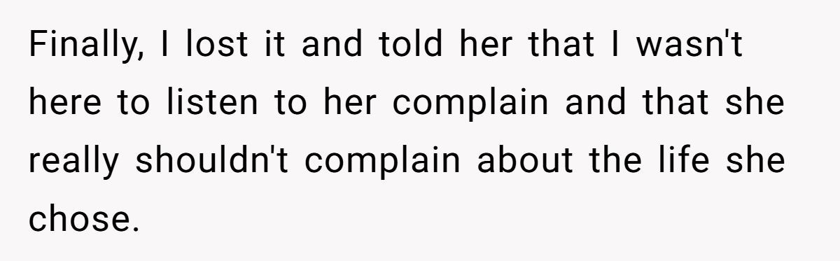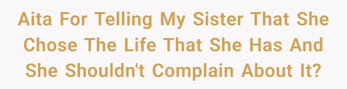Years later, she’s exhausted, juggling low-wage jobs, a family, and a never-ending to-do list. But when she opened up to her younger sister about how tired she was, the OP didn’t offer sympathy. Instead, she dropped a truth bomb: You chose this life. You don’t get to complain about it now.