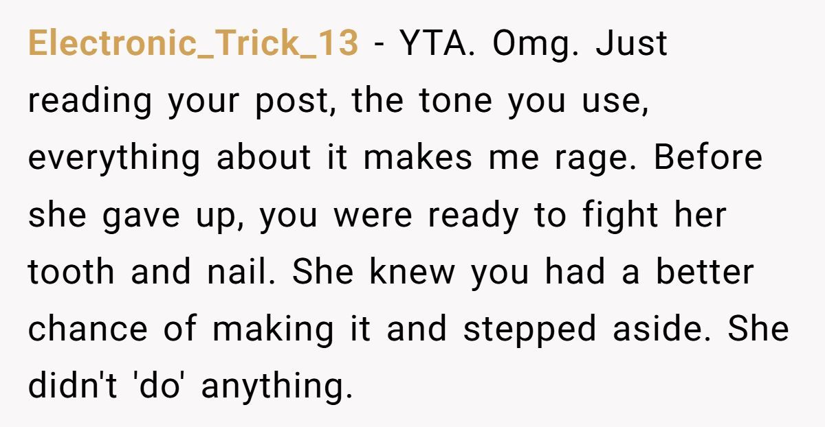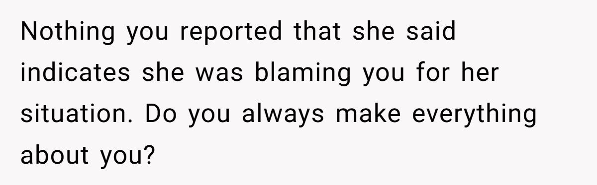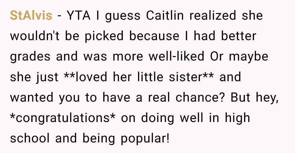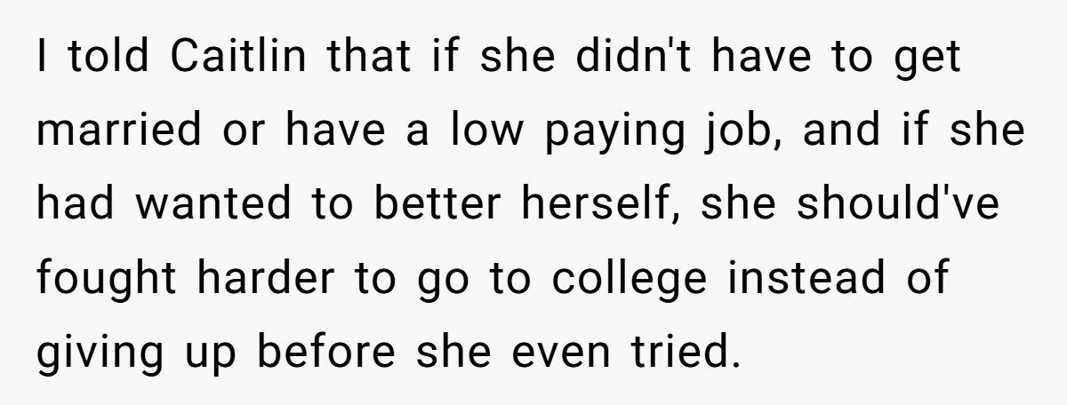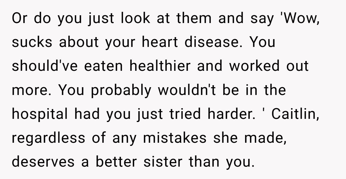 Psychologist Dr. John Gottman once said, “Empathy fuels connection; judgment fuels defensiveness.” The OP’s words, though based in truth, lacked compassion. By framing Caitlin’s life as a simple cause-and-effect decision tree, she dismissed the complexity of her sister’s sacrifice and her pain.