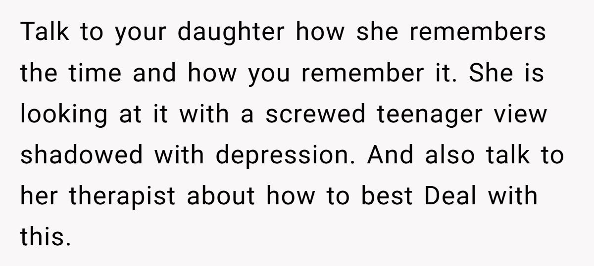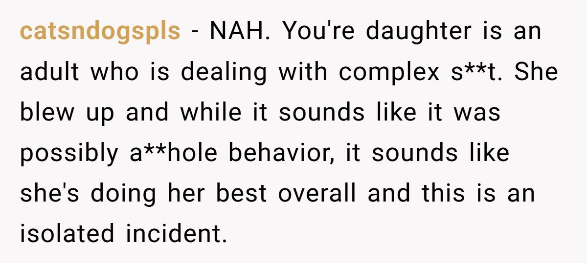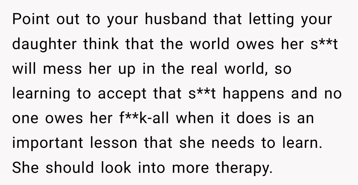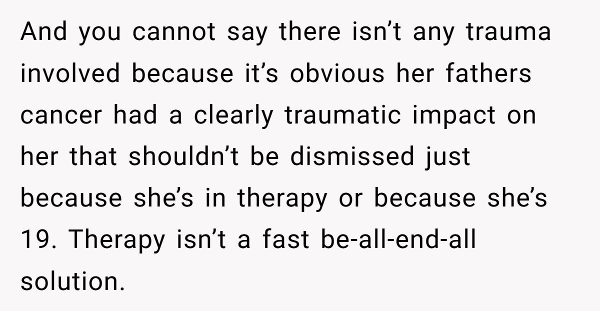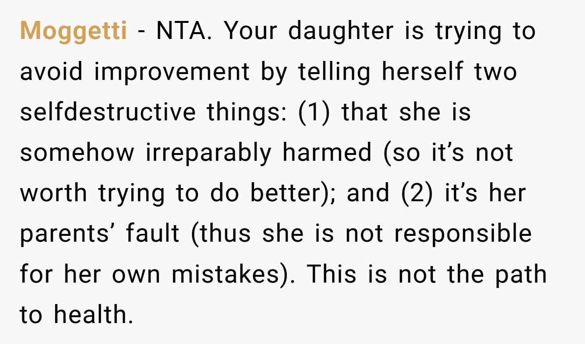 Commenters felt the daughter needed to take responsibility, seek more therapy, and stop using hardship as an excuse to avoid growth.