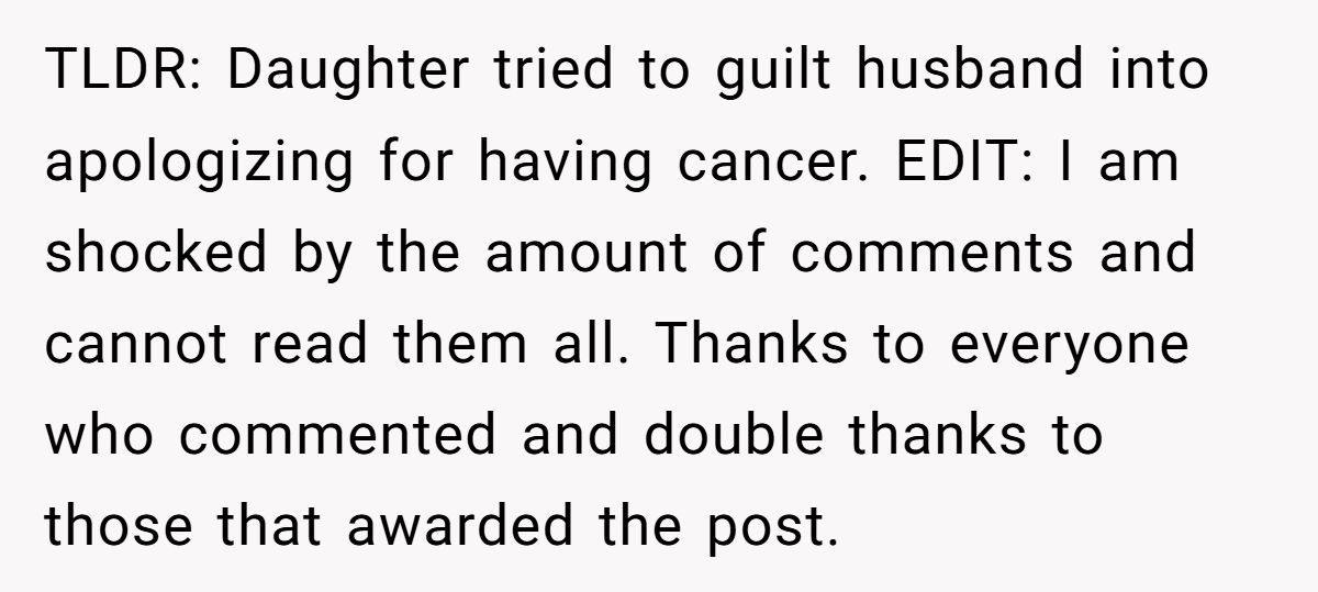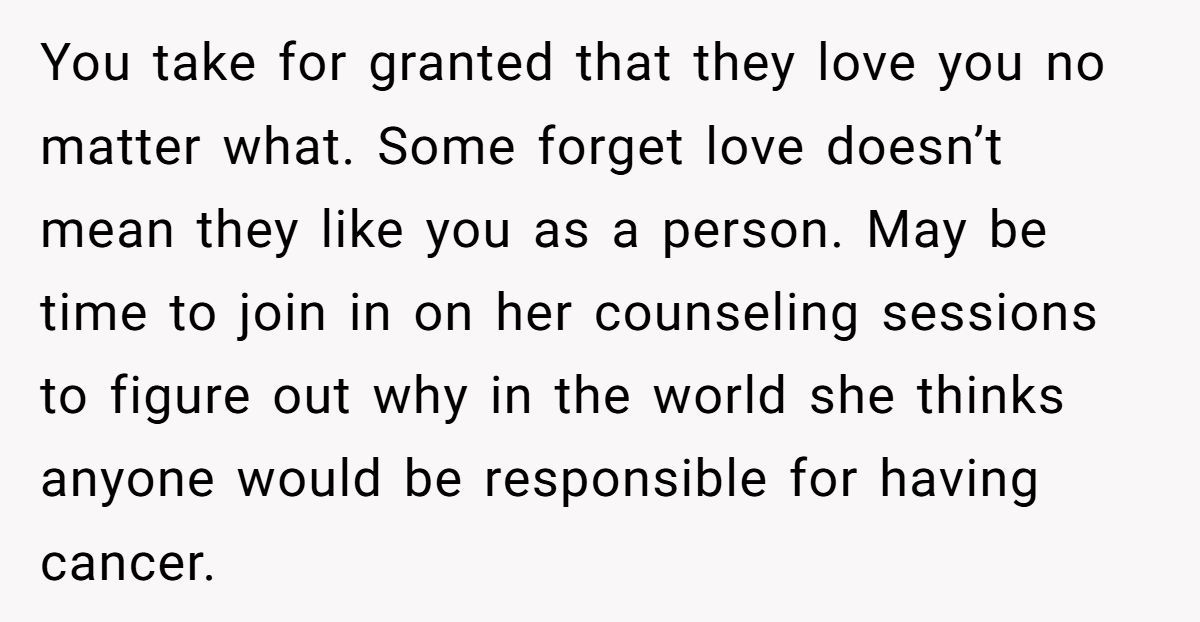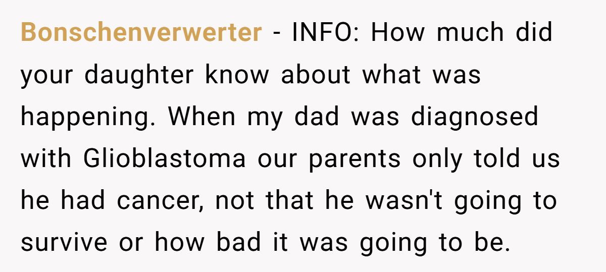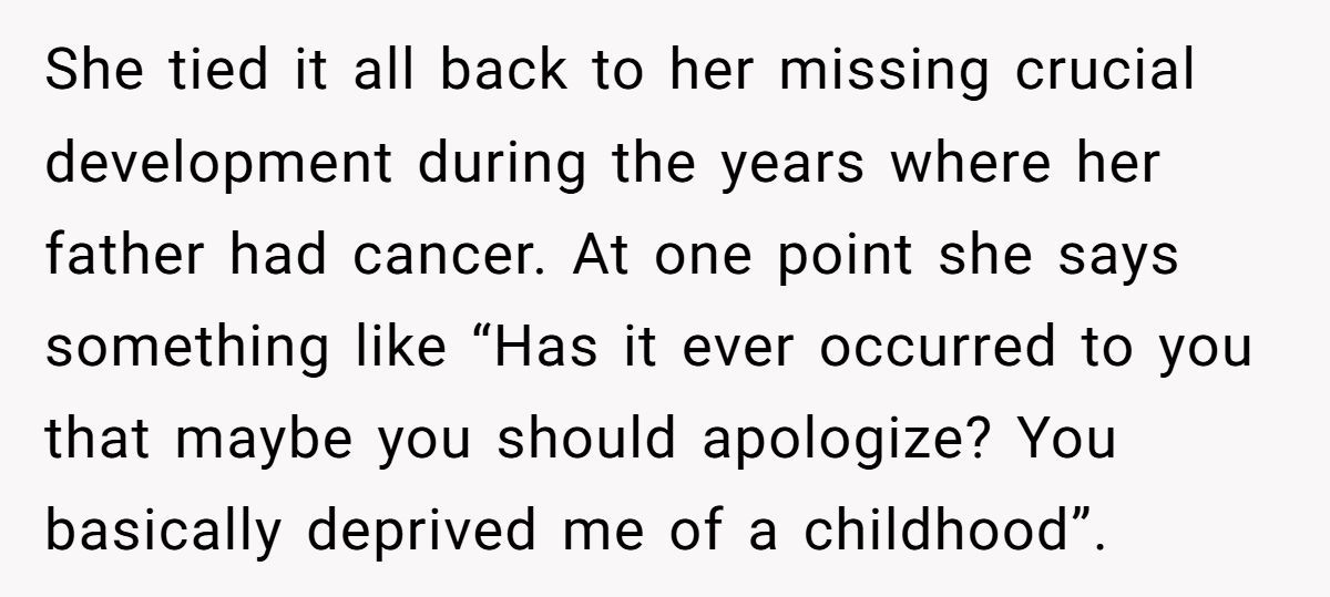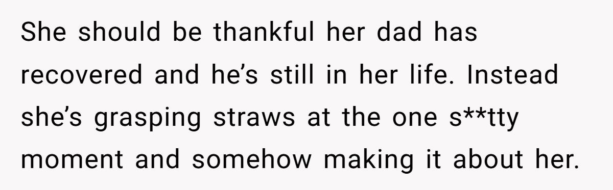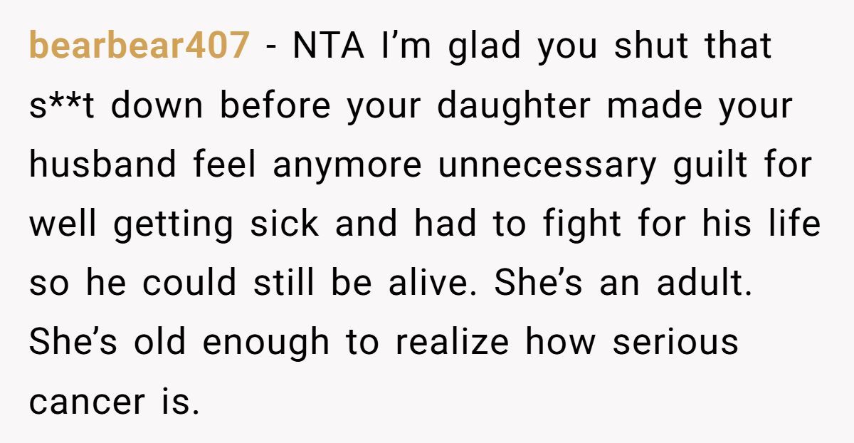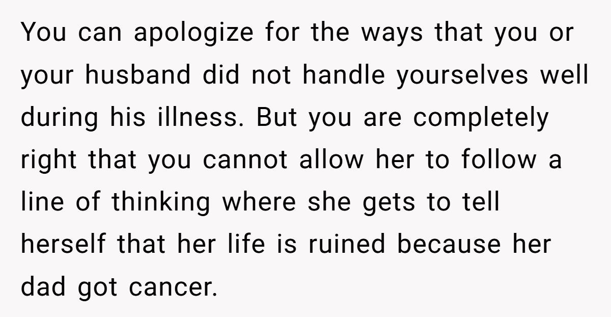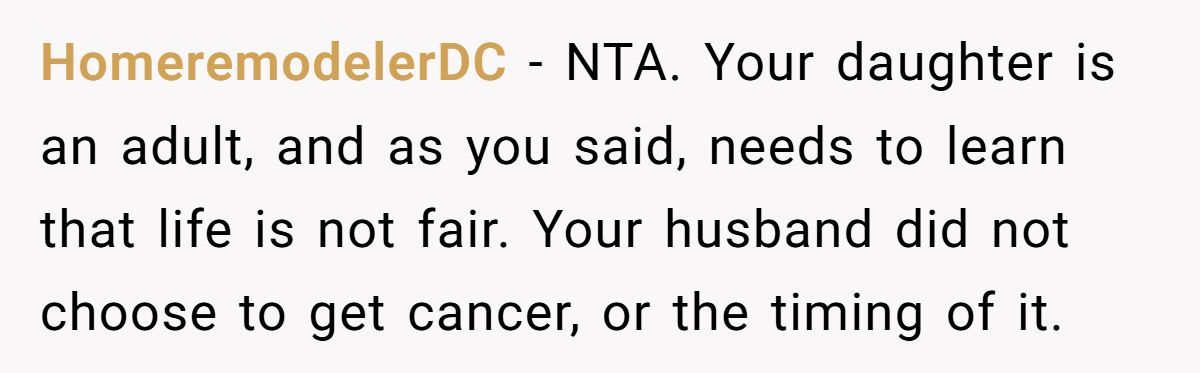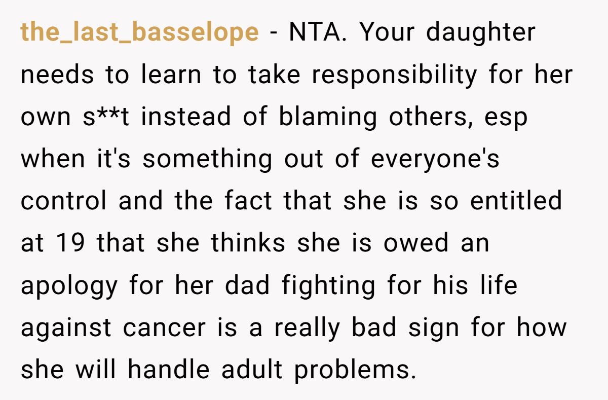 Many said OP is not the AH, agreeing that the daughter blaming others for her struggles isn’t fair. They stressed that life is unpredictable, and her dad getting cancer wasn’t anyone’s fault.