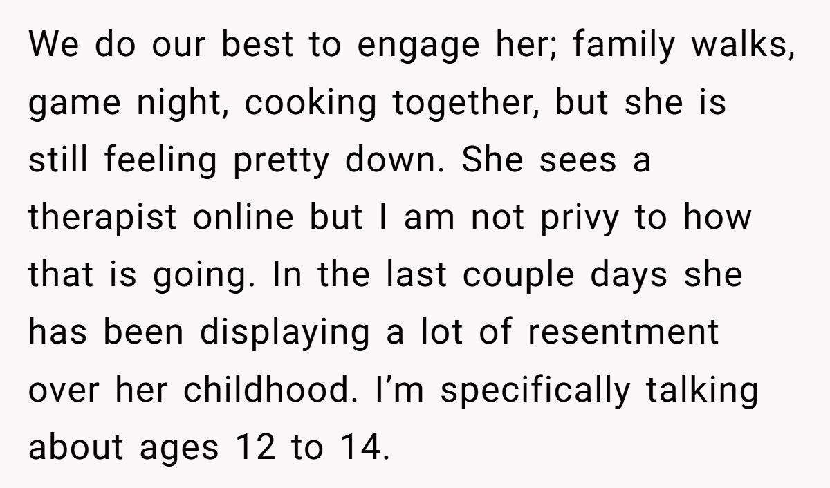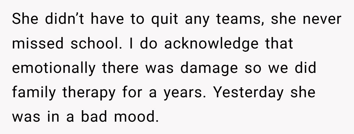 Family therapy, which they had tried before, might still be the best path forward. A professional could help each of them name their wounds. the father’s guilt, the daughter’s resentment, the mother’s fear and begin the process of healing, not defending.
