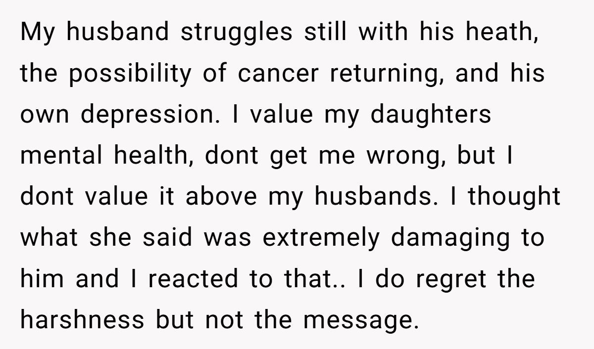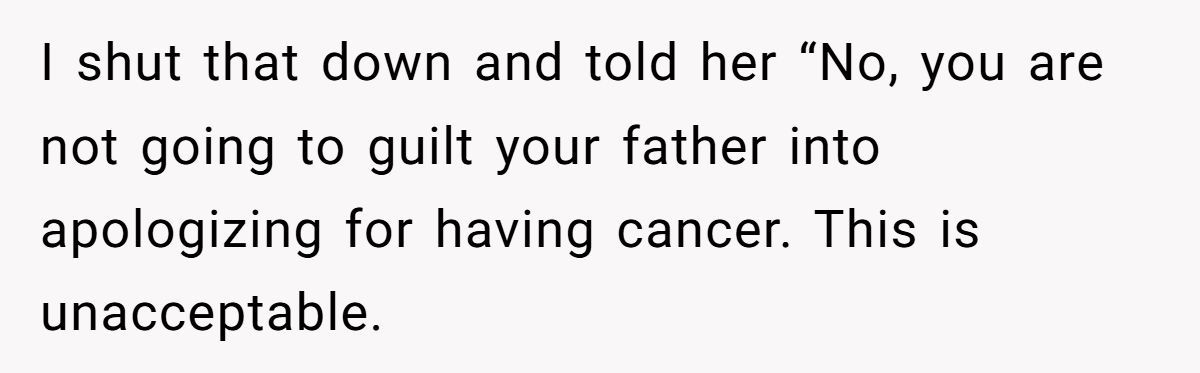 The mother’s reaction was instinctive. She had watched her husband suffer through chemo, surgeries, and nights where death sat just outside the bedroom door. She had stood by him, holding their family together while their daughter grew quieter and more withdrawn. She had seen the guilt in his eyes, even after the cancer was gone.