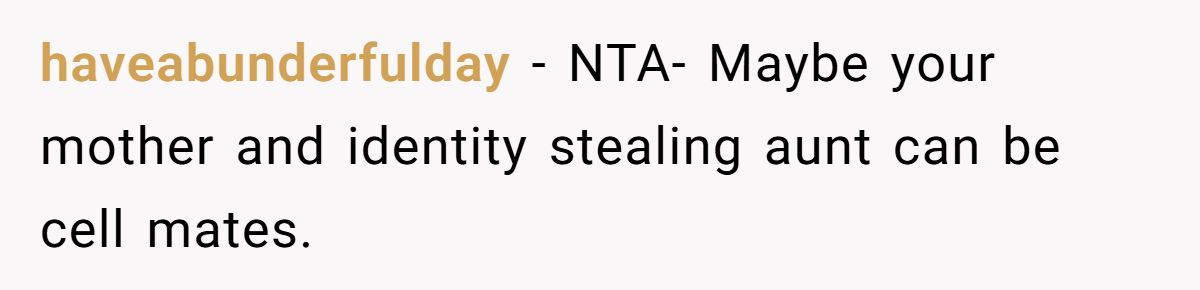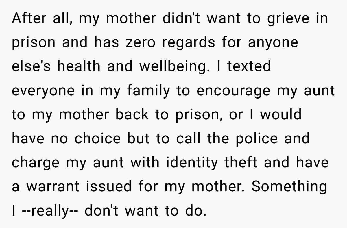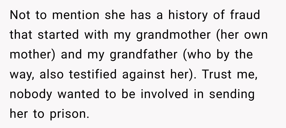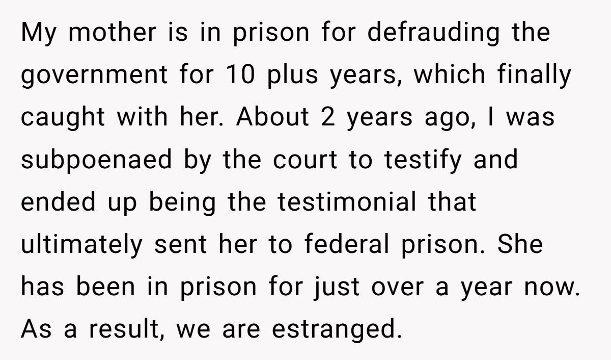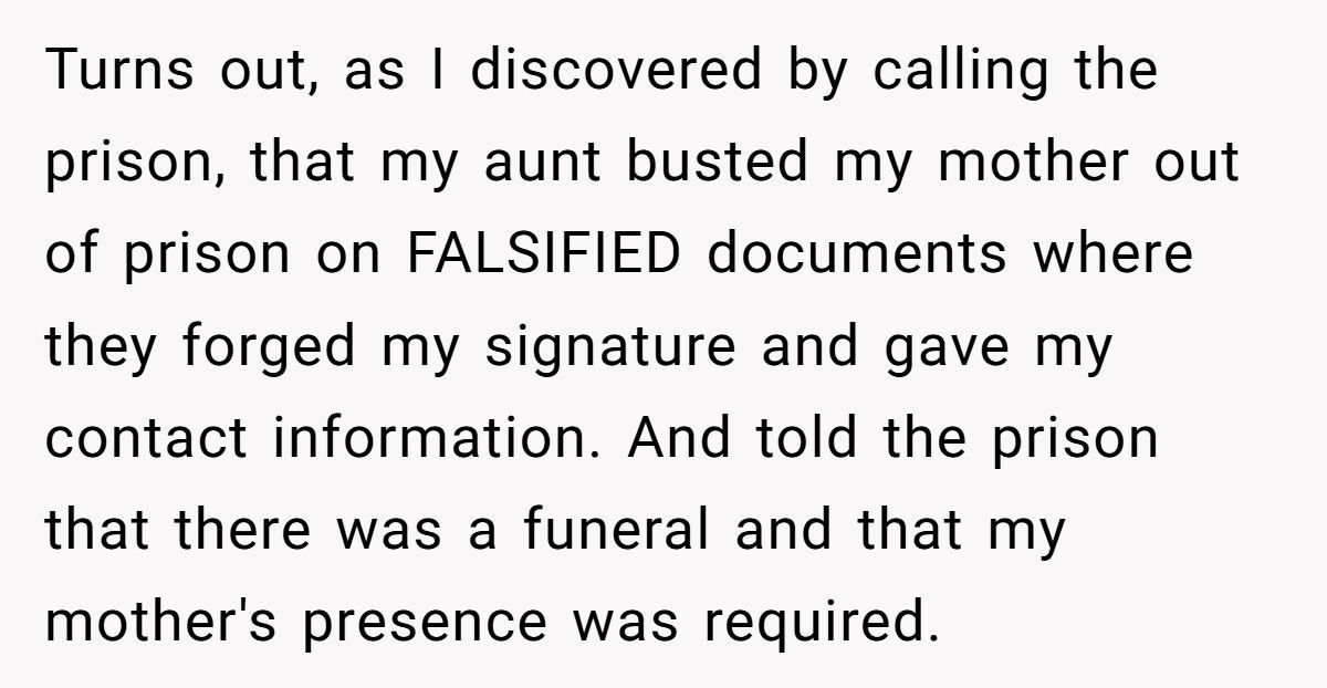Imagine discovering your aunt forged your signature to bust your mother out of prison for a nonexistent funeral! One Redditor, whose testimony sent her mother to federal prison for fraud, faced this shocking betrayal when her aunt used her identity to secure a furlough during her grandfather’s passing.