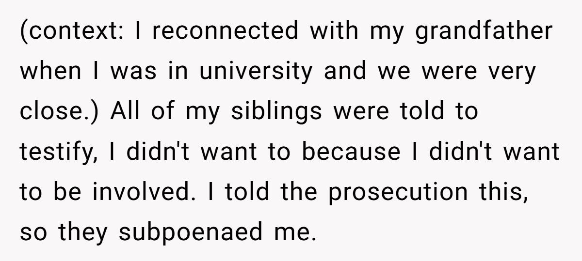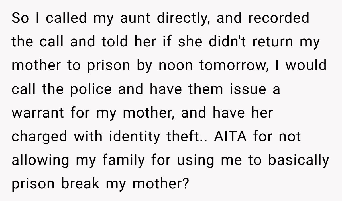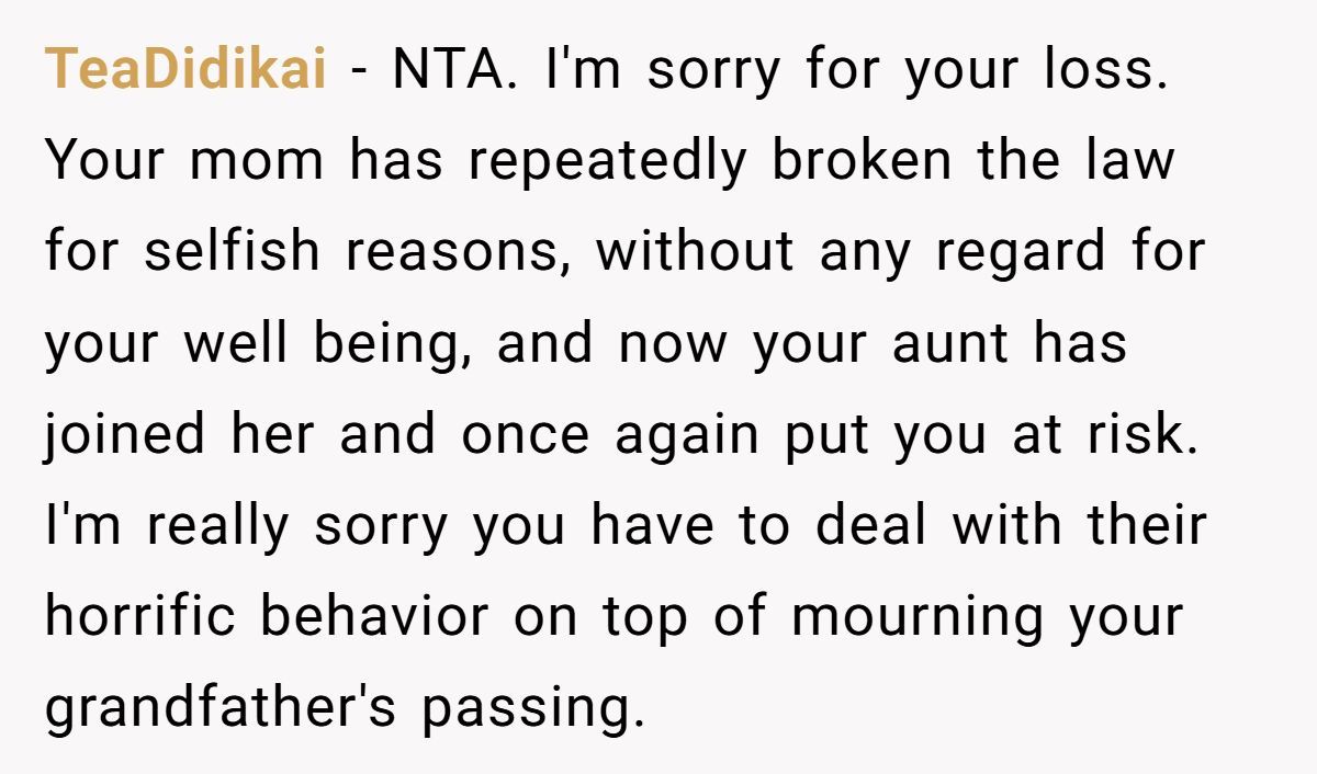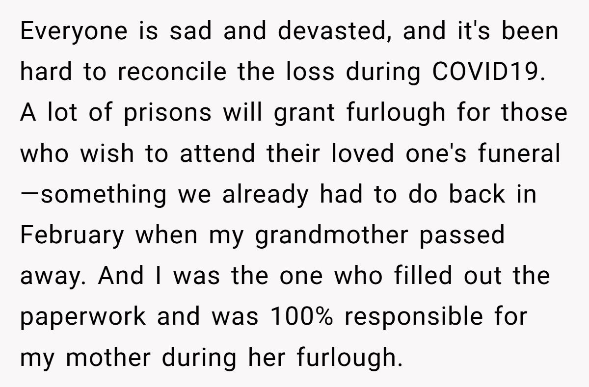 Imagine discovering your aunt forged your signature to bust your mother out of prison for a nonexistent funeral! One Redditor, whose testimony sent her mother to federal prison for fraud, faced this shocking betrayal when her aunt used her identity to secure a furlough during her grandfather’s passing.