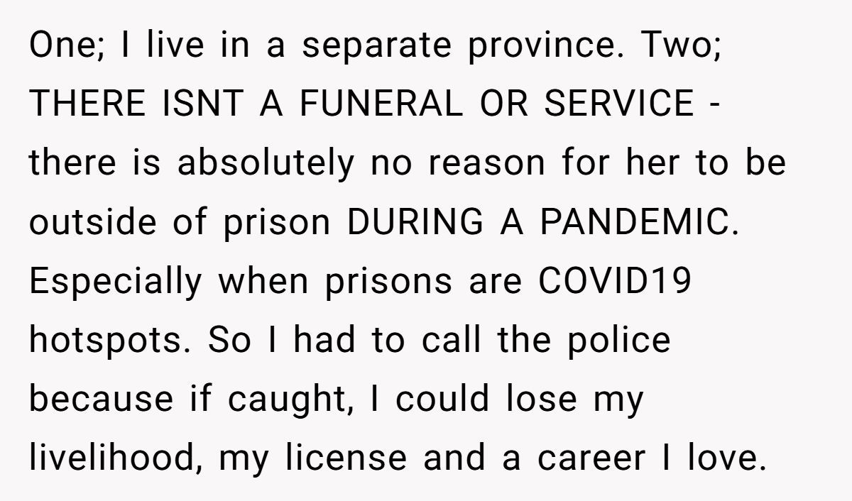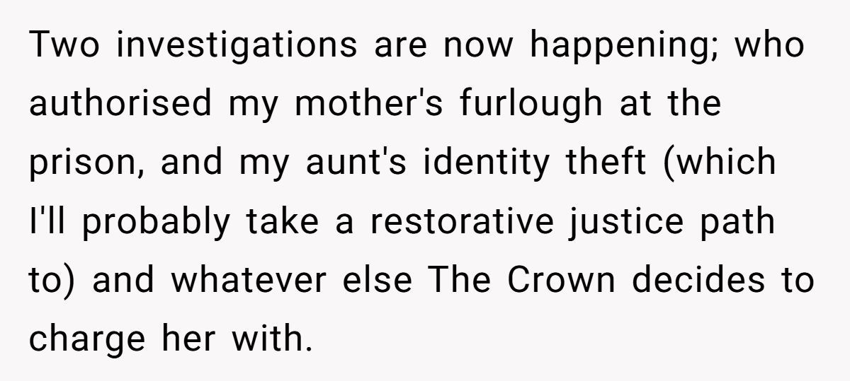 One woman shared a harrowing story of reporting her mother’s illegal prison furlough, orchestrated by her aunt forging her signature, to protect her career during a time of grief