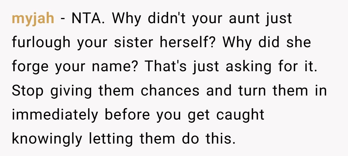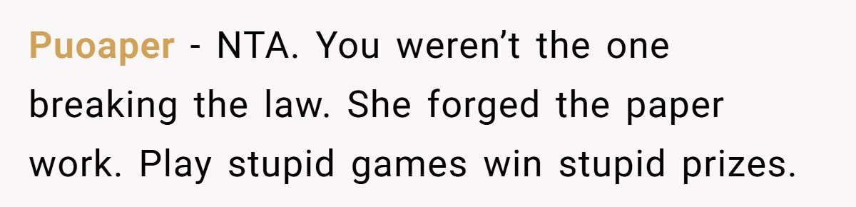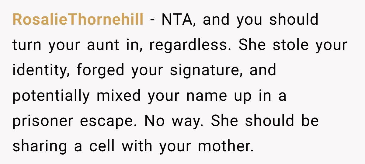 Some claimed that the aunt’s forgery was a serious crime deserving punishment, advising that the Redditor’s response was appropriate