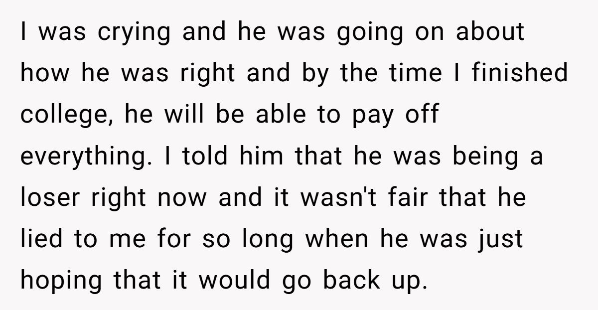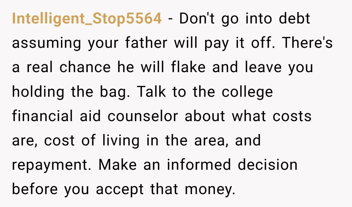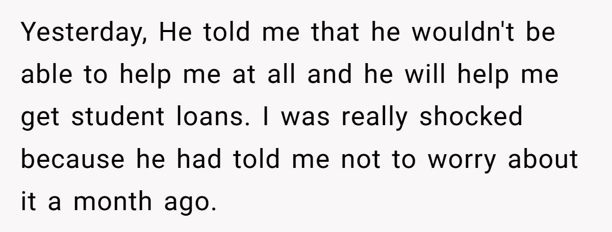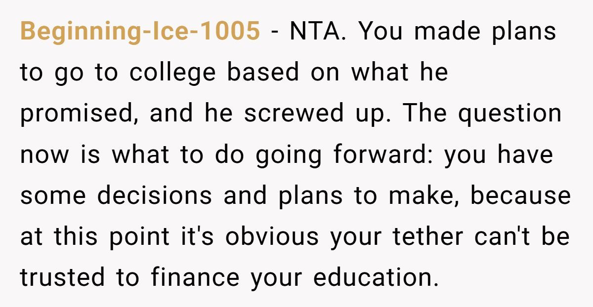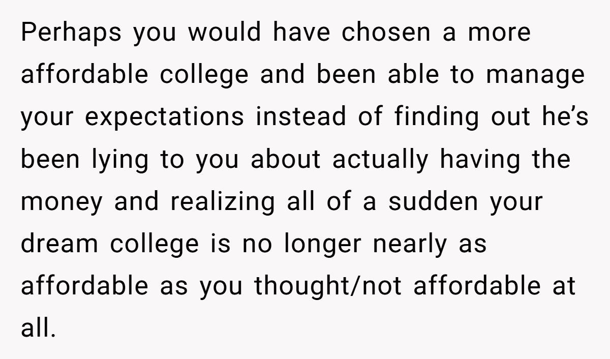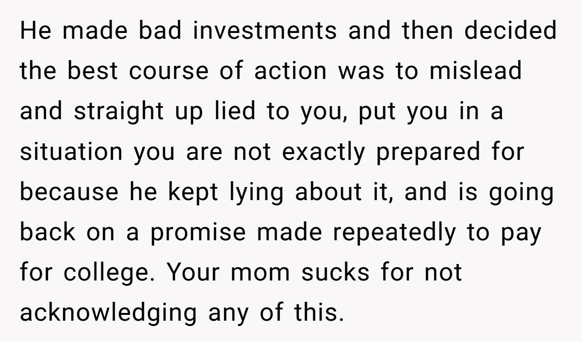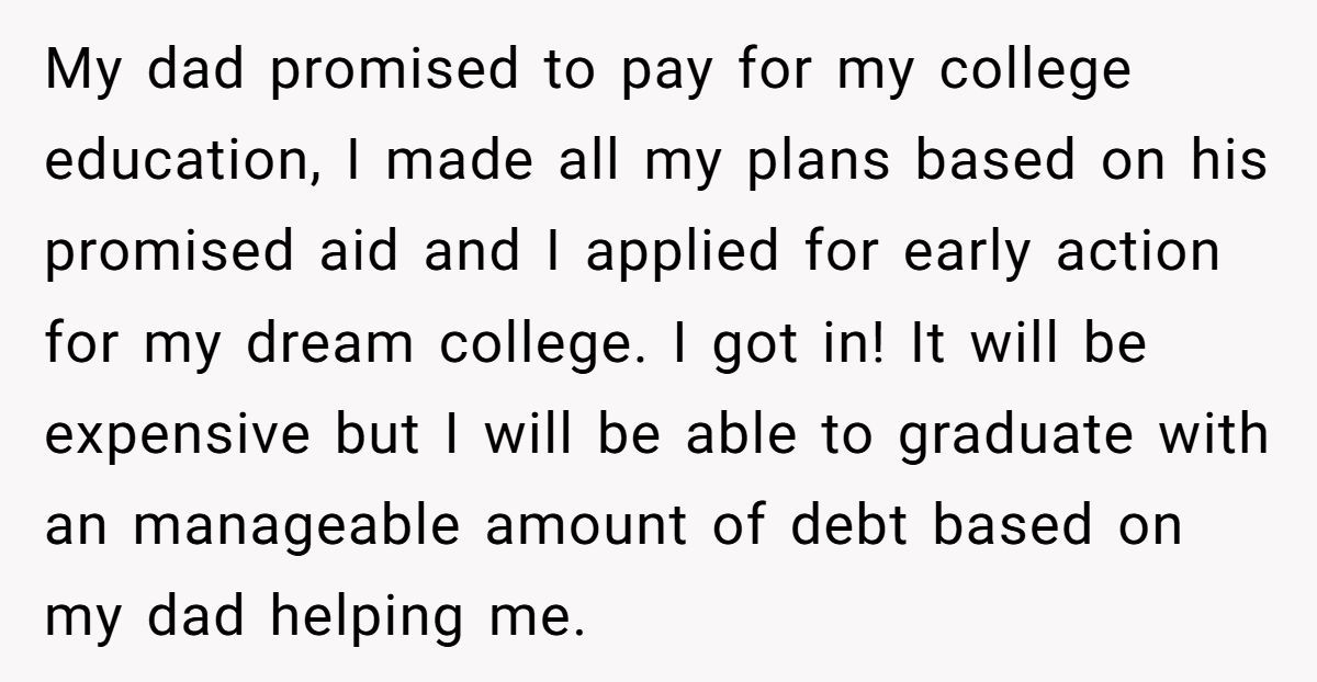 The Redditor, an 18-year-old recently accepted to their dream college, had always believed their education was covered. Their father had promised again and again that a $70,000 college fund had been set aside for them. So they applied, committed, and planned their future around that assurance.