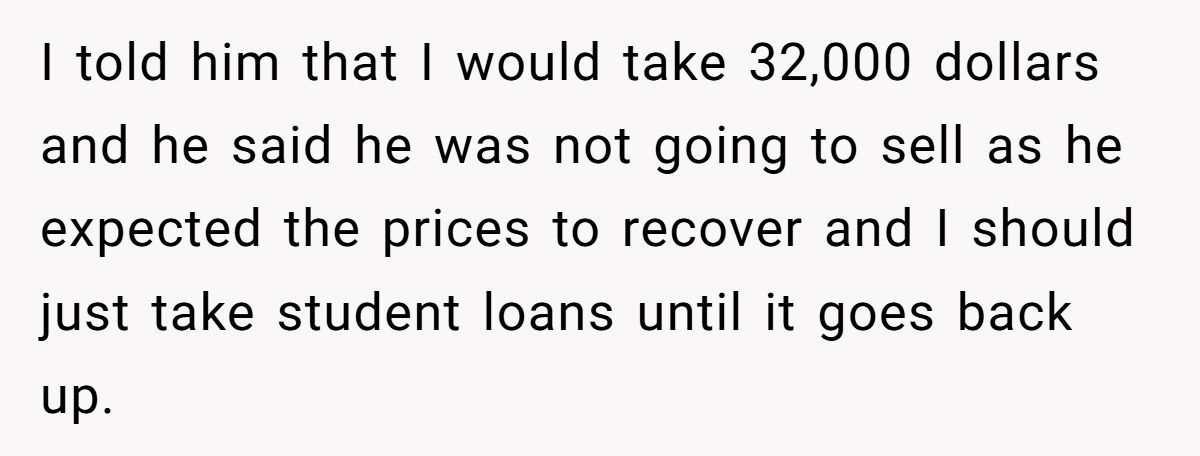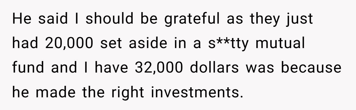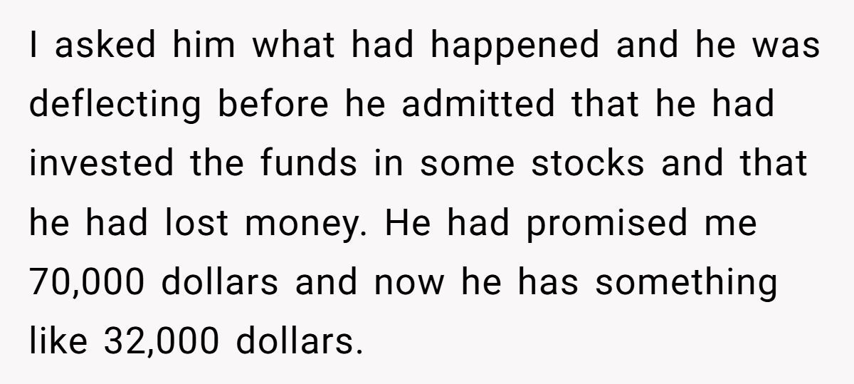 The dad admitted he had invested a large portion of the fund in individual stocks, without ever telling the OP and those investments tanked. Only $32,000 remains, and even that he refuses to cash out. Instead, he’s holding onto it, hoping the market rebounds.