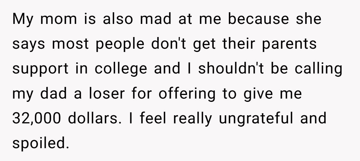Blindsided and furious, the OP lashed out. They called their dad a “loser” in front of the family. Now they’re being told to apologize, mainly by their mom, who reminded them that most kids don’t get any parental help for college at all. But is that really the point?
