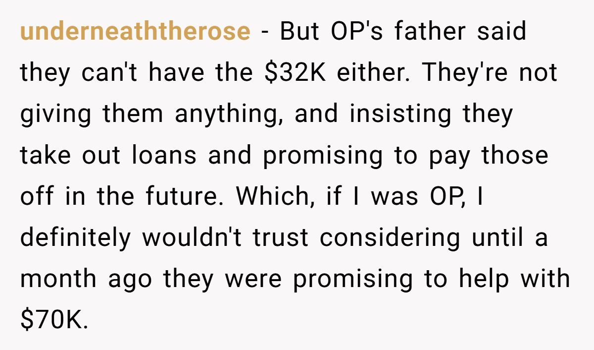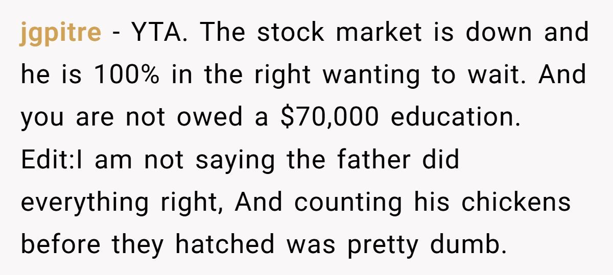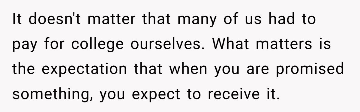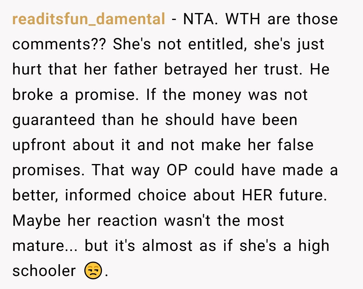More commenters pointed out that OP’s father promised money he couldn’t guarantee and then offered nothing when it mattered most. While one dissenter blamed OP for feeling entitled, the majority agreed the broken promise—and poor financial planning—justified OP’s reaction.
