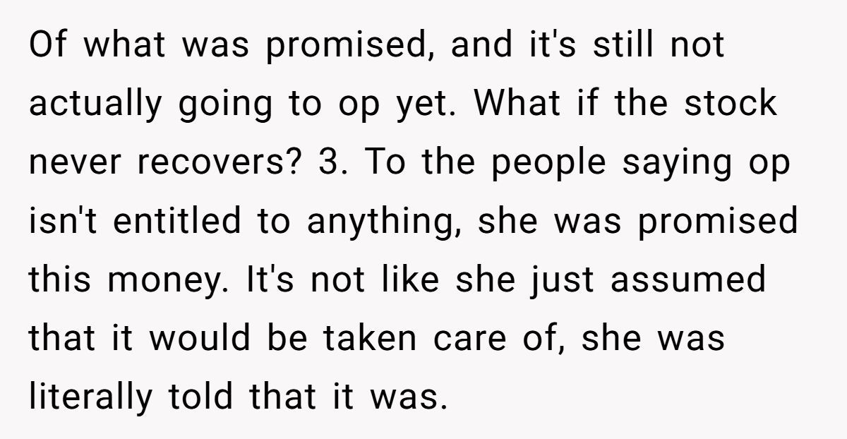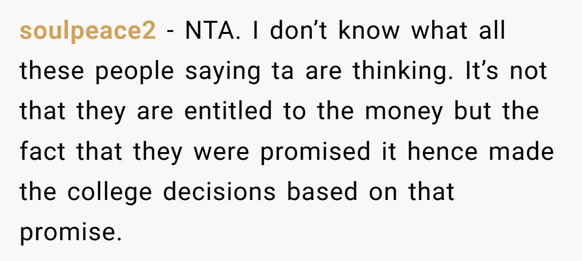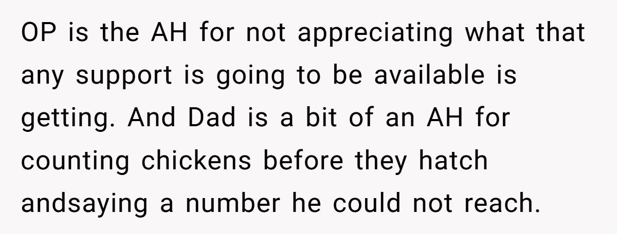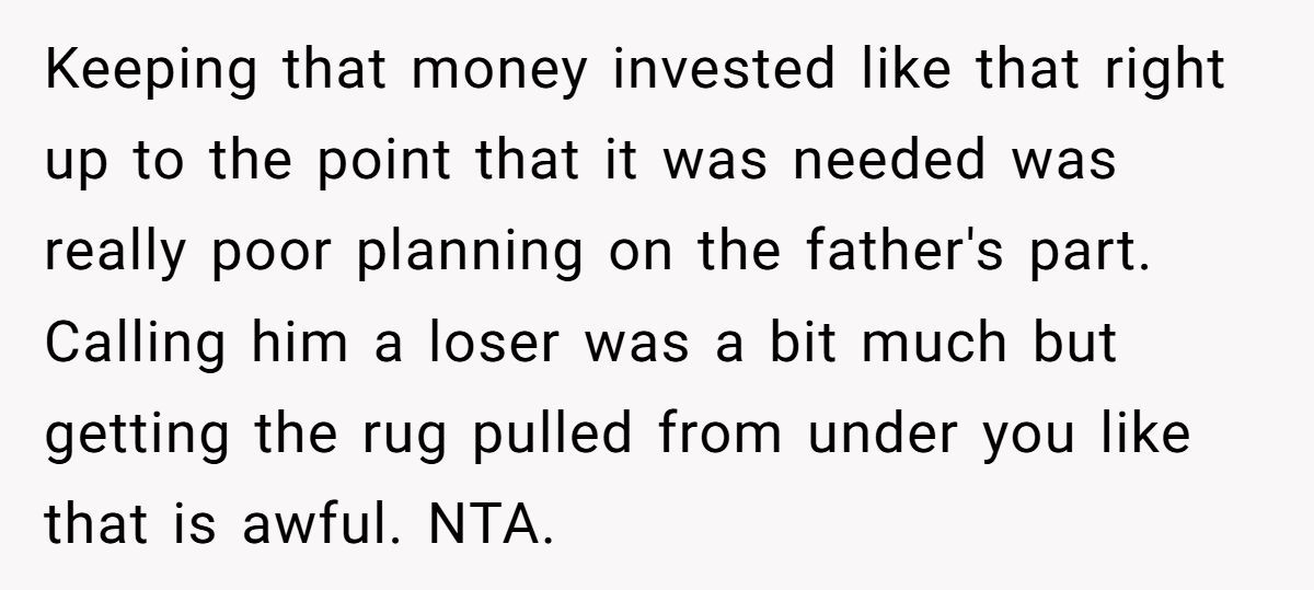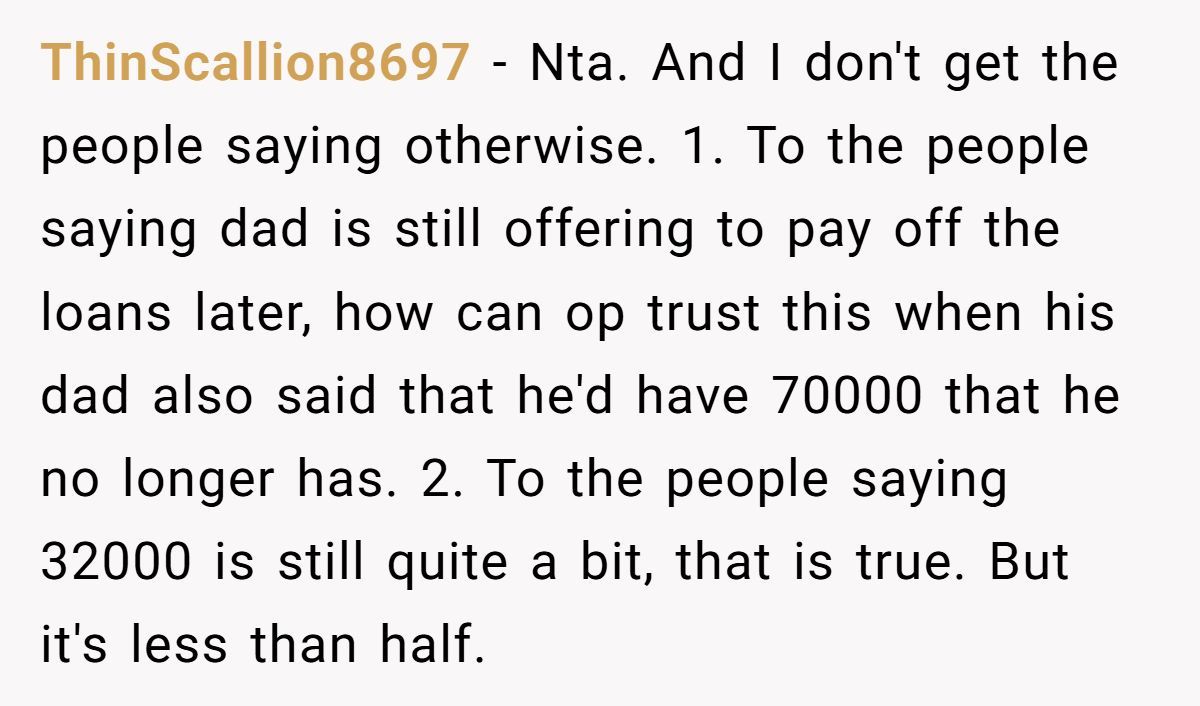 More commenters pointed out that OP’s father promised money he couldn’t guarantee and then offered nothing when it mattered most. While one dissenter blamed OP for feeling entitled, the majority agreed the broken promise—and poor financial planning—justified OP’s reaction.
