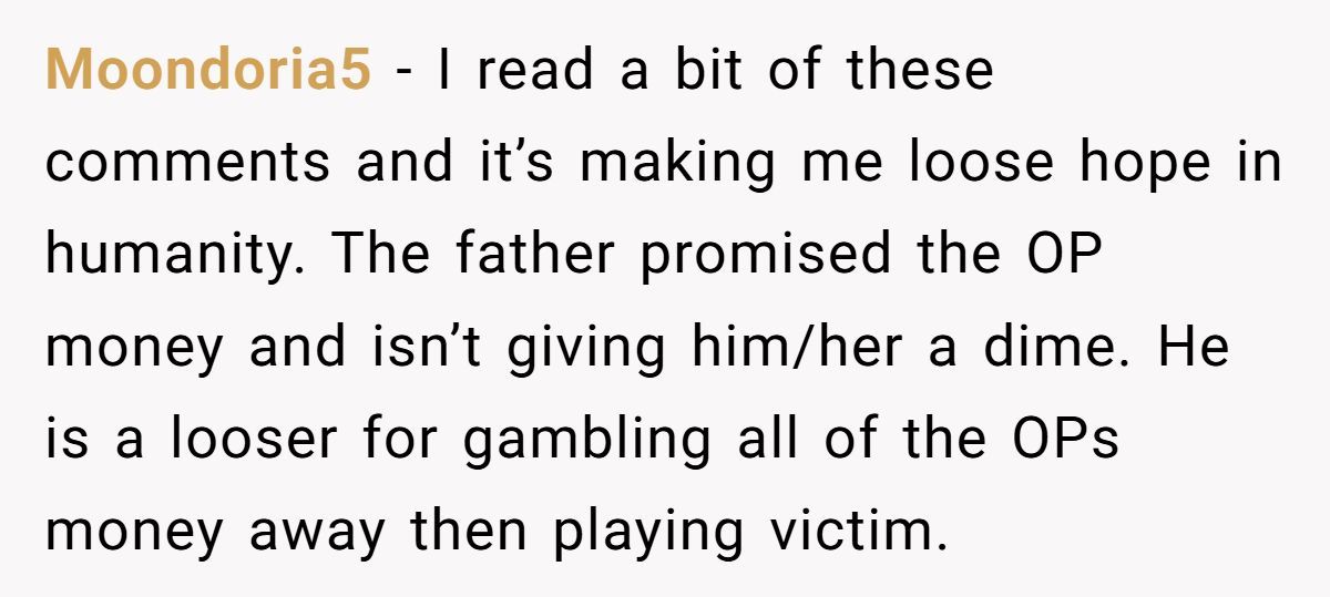 What stings most is the secrecy. The father never gave a heads-up that the money was at risk. He didn’t check in, offer options, or revise the promise. He just hoped for the best—and now expects his child to understand the loss and pivot like it’s no big deal.