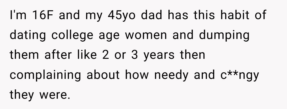 The teenager’s story begins in the living room of the home she shares with her 45-year-old father. For years, she’s watched him move from one young girlfriend to another, never dating anyone over 24, and always breaking up with them around the two-year mark. The common theme? As soon as a woman showed emotional vulnerability—asking for more time, wanting deeper commitment—he’d bolt.
