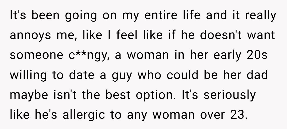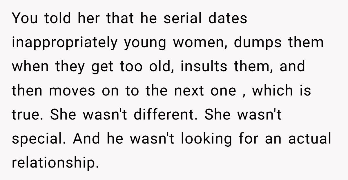 Psychologist Dr. John Gottman notes in Psychology Today that “patterns in relationships are rarely about isolated behavior—they often reflect unaddressed emotional wounds or fear of intimacy.” If this father continually dates younger women and exits the relationship at the first sign of emotional closeness, it may be less about the women—and more about his own avoidance.