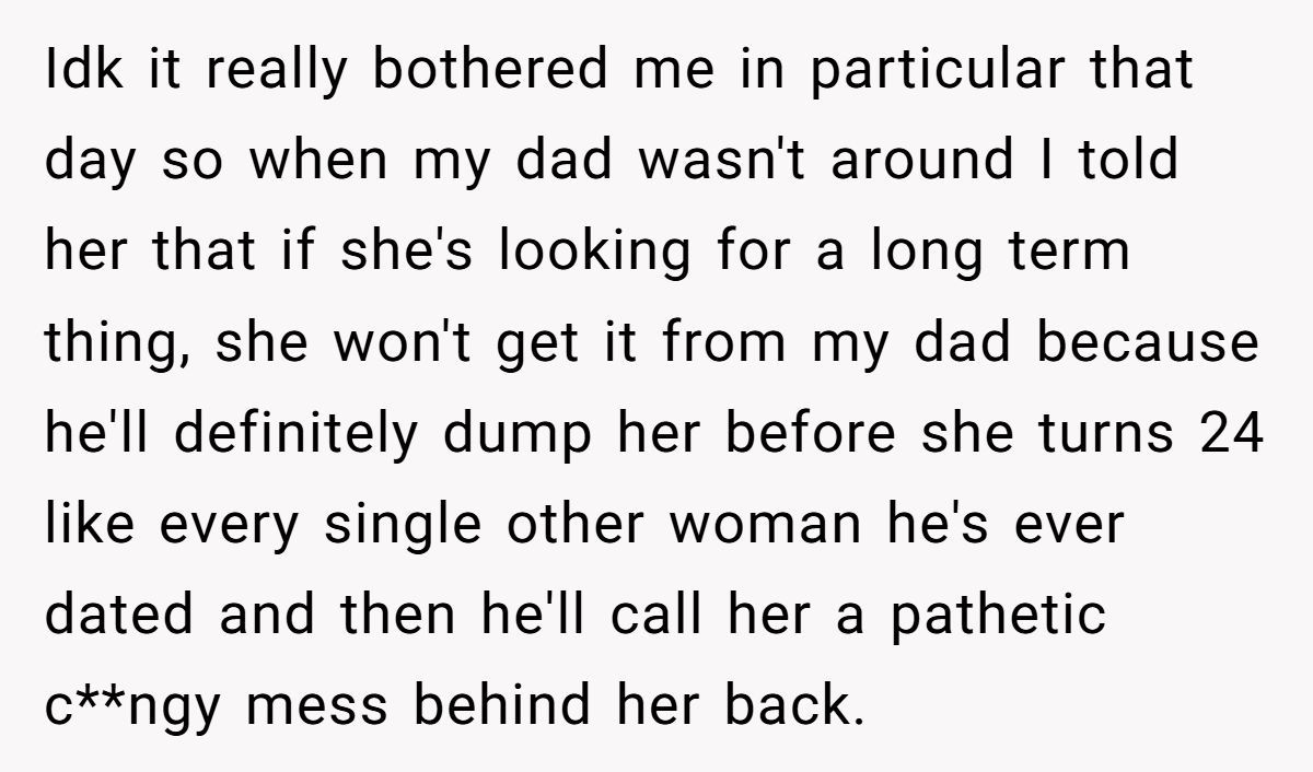 So when his newest girlfriend walked in—just five years older than the teen herself—the girl couldn’t stay silent. During a private moment, she told the woman, gently but honestly, that her dad had a “track record.” That he’d likely ghost or criticize her for being “too emotional” when things got serious.