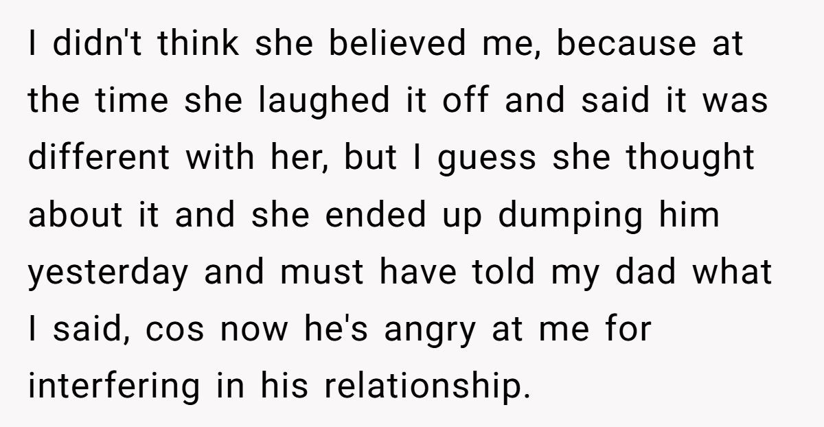 This teen didn’t just spill the tea—she served it piping hot, with a side of truth. Her decision to warn her dad’s girlfriend may have ended a relationship, but it also revealed something deeper: her exhaustion with being a silent observer to a cycle that hurt everyone involved.