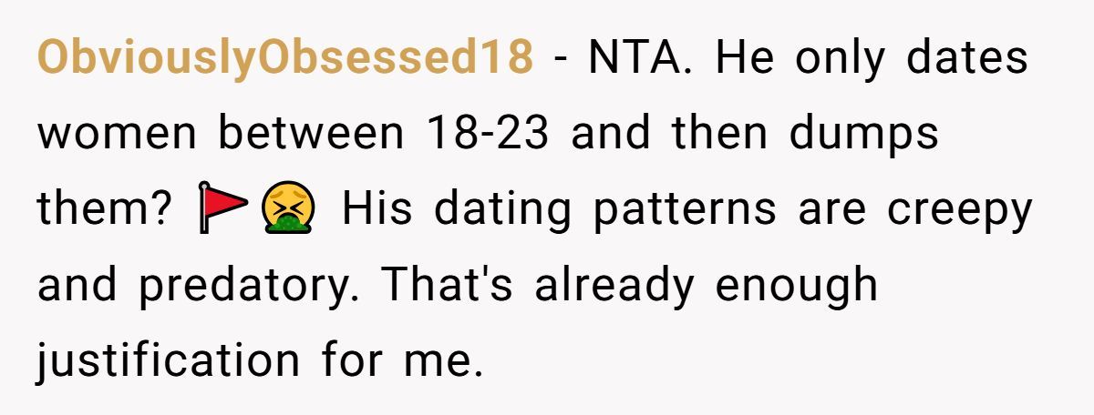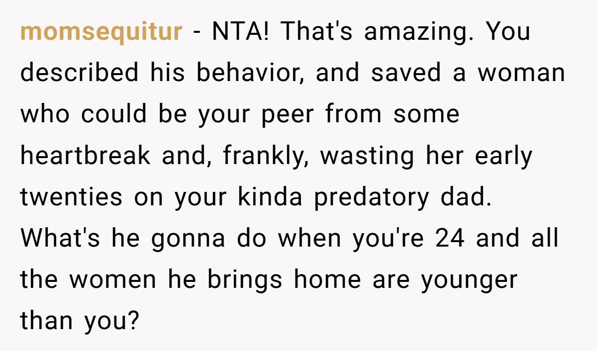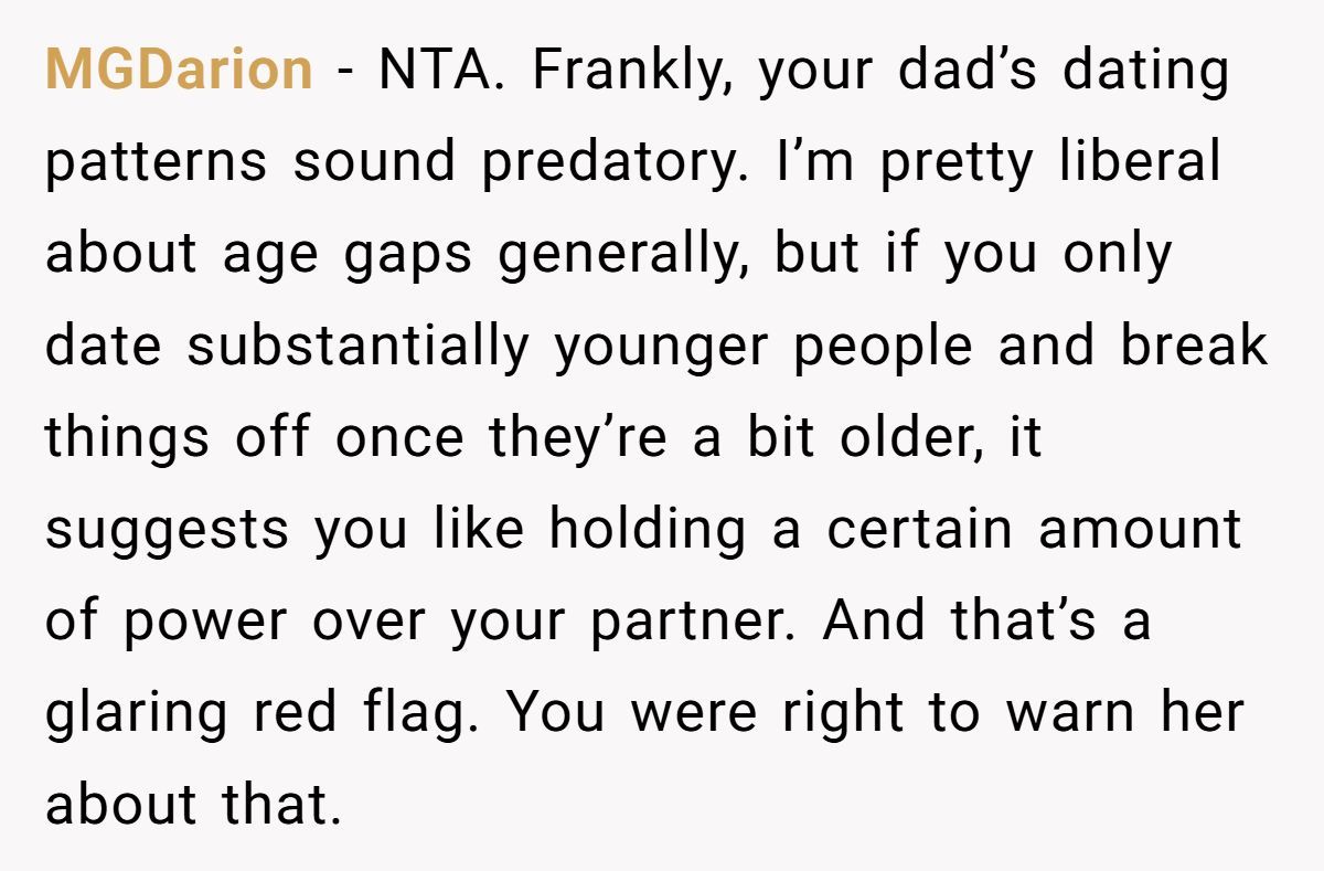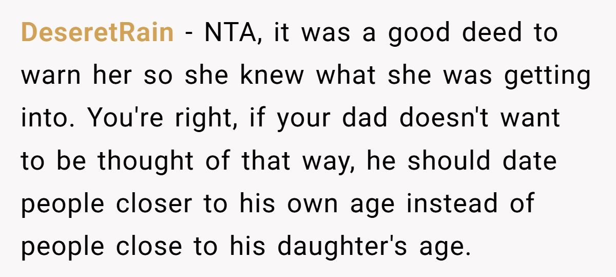 They praised her honesty and saw her warning as a good deed, arguing that if her dad didn’t want to be judged, he should date women closer to his age.