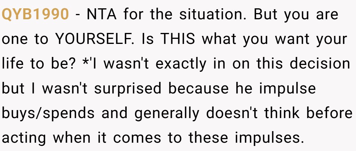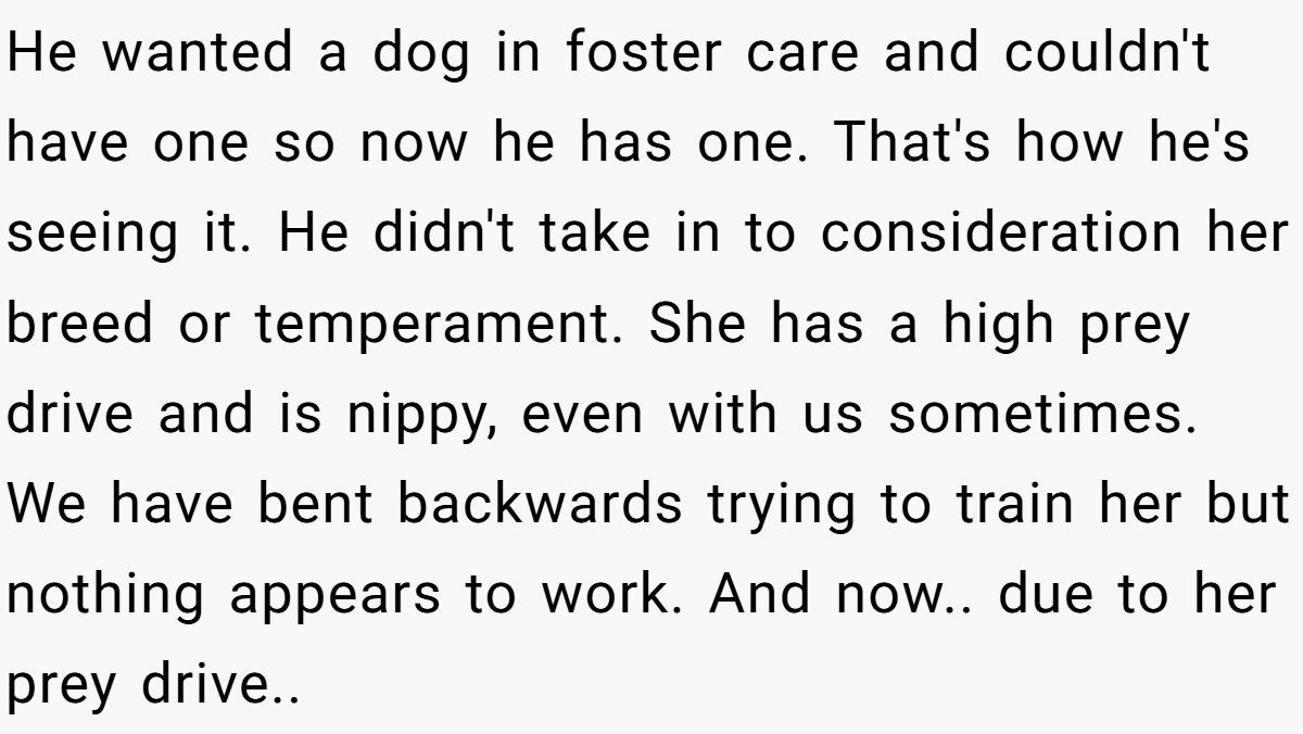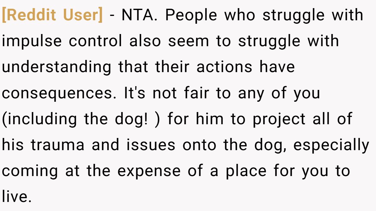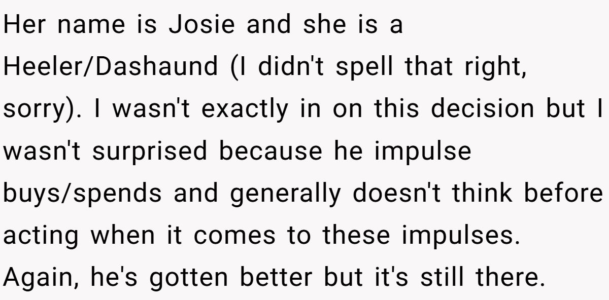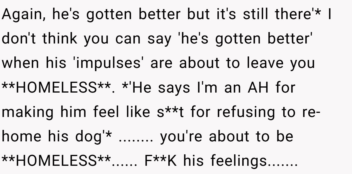 Other commenters agreed OP was NTA. They said the husband’s impulsive dog adoption was irresponsible and warned that his poor choices could ruin them both. Many urged OP to rethink the relationship.