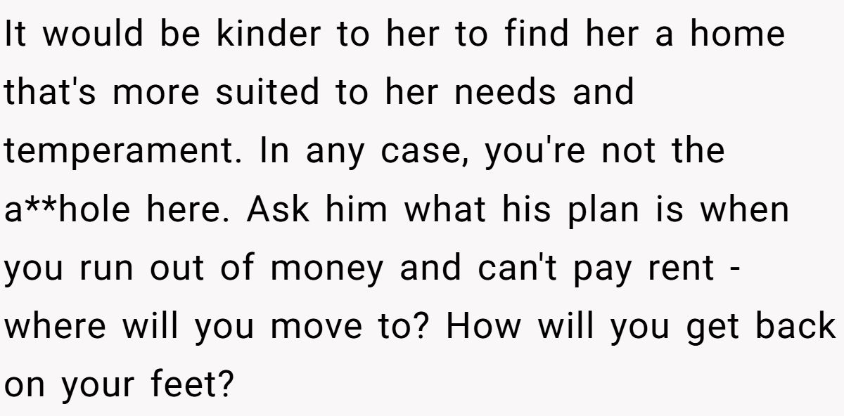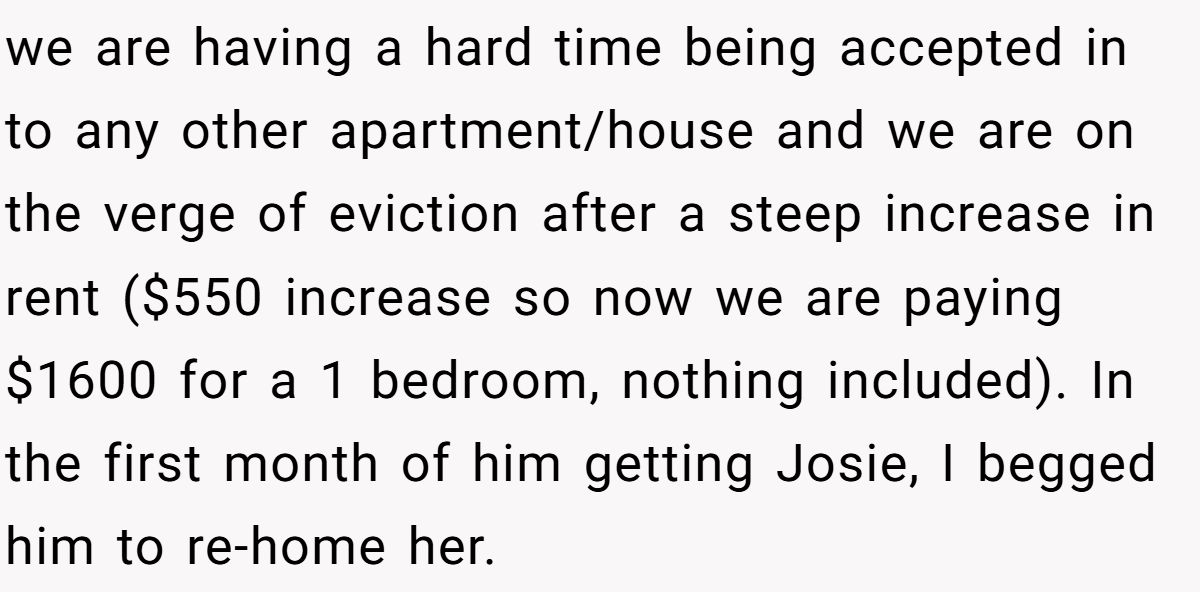 Meanwhile, others said your husband’s impulse buying is unfair to you and the dog. Many felt rehoming her would be kinder and urged you to ask him serious questions about how he plans to pay rent before it’s too late.