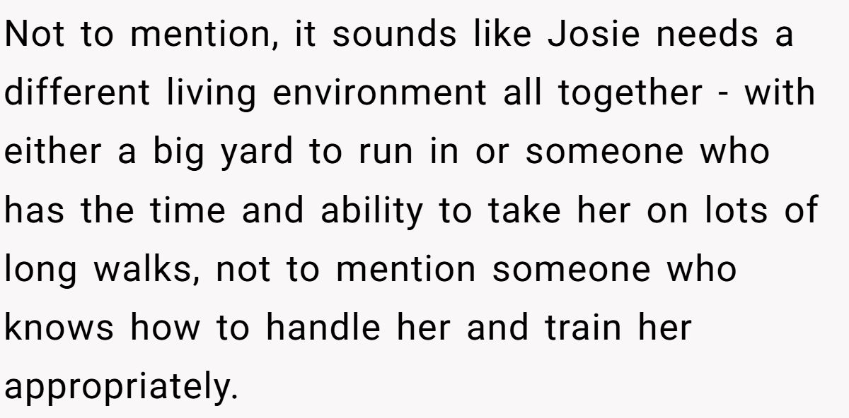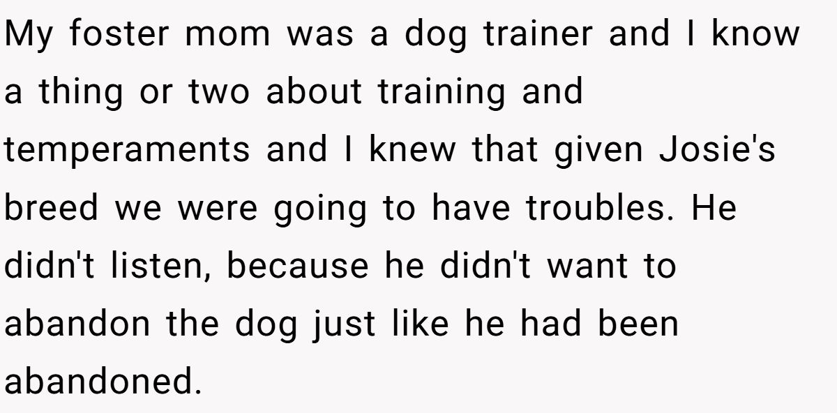 Her husband’s love for Josie wasn’t just about the dog. It was about not abandoning someone the way he’d been abandoned. But love doesn’t pay rent. And the woman, with years of experience training dogs during her foster years, saw it clearly: Josie wasn’t a fit for their life.