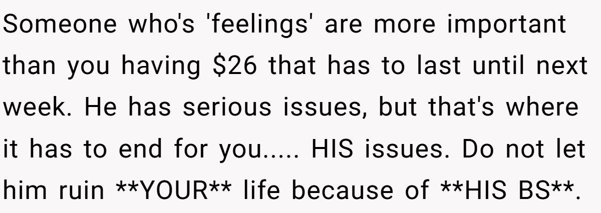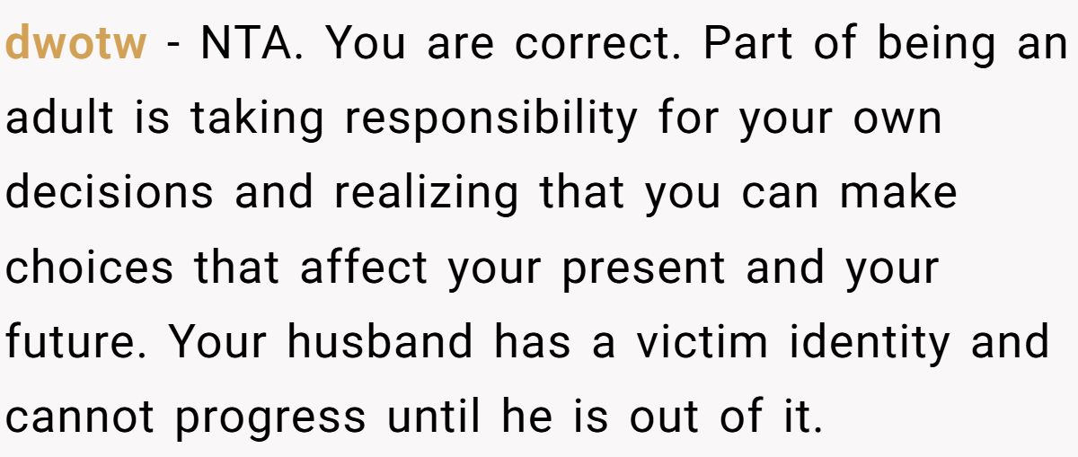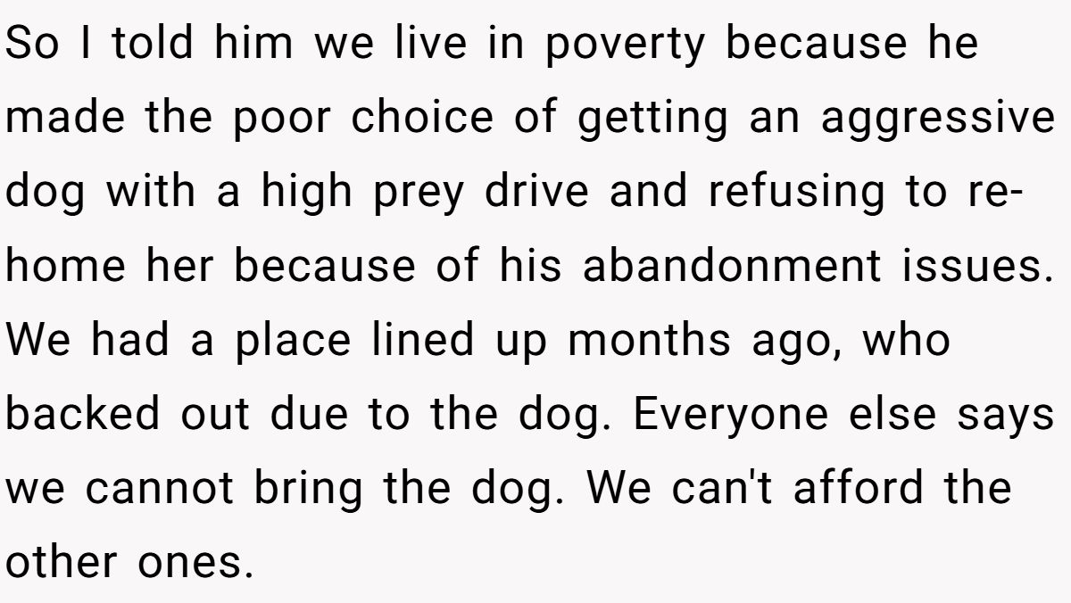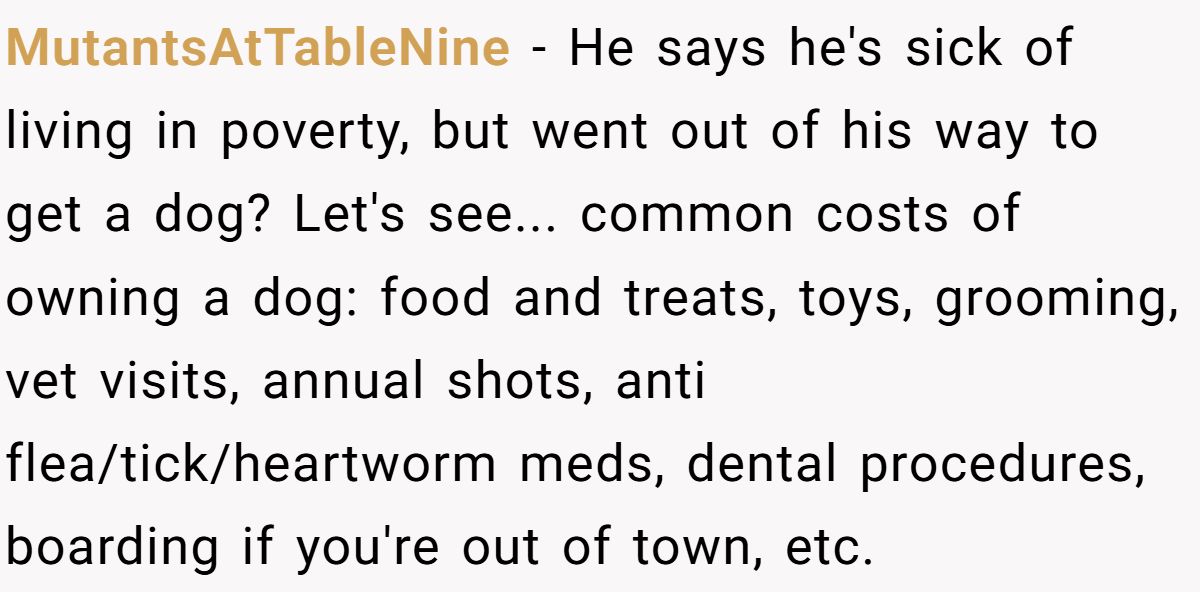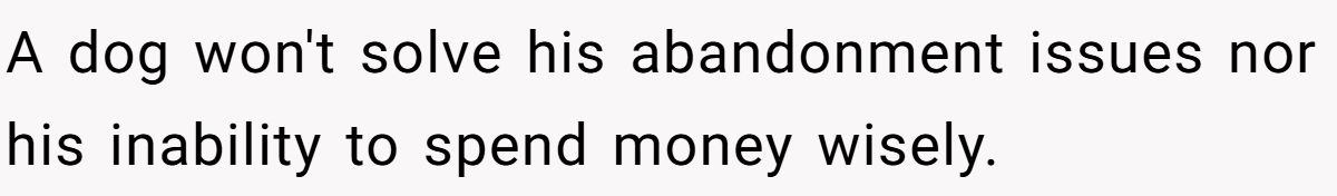 Commenters echoed that OP was NTA. They called out her husband’s poor choices, like getting a dog despite struggling financially and said he needed to grow up and take responsibility instead of acting like a victim.